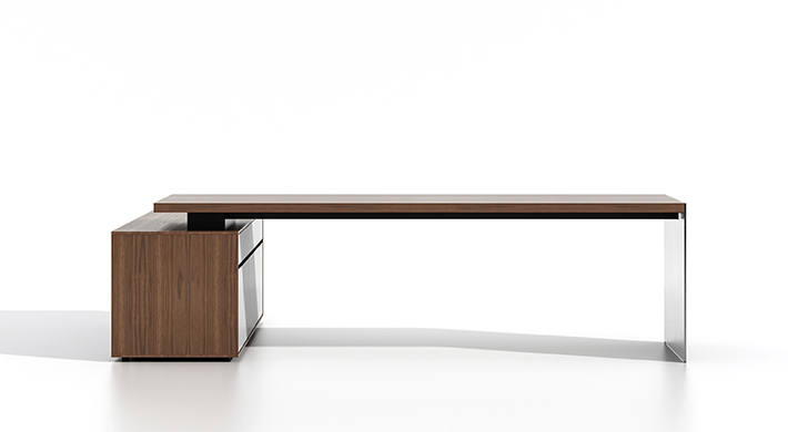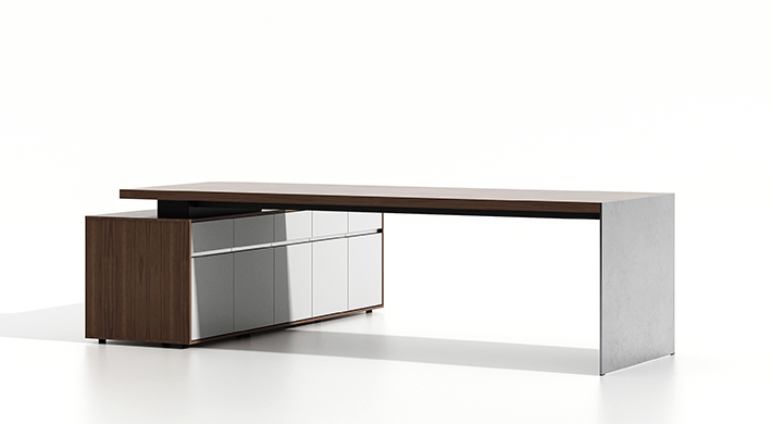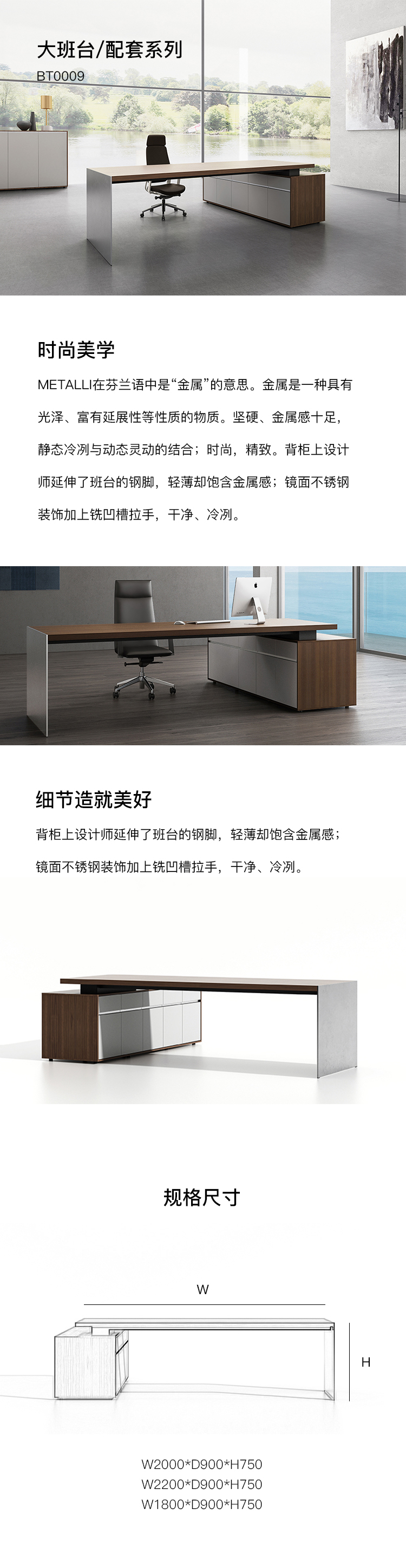 METALLI在芬兰语中是“金属”的意思。金属是一种具有 光泽、富有延展性等性质的物质。坚硬、金属感十足, 静态冷冽与动态灵动的结合;时尚,精致。背柜上设计 师延伸了班台的钢脚,轻薄却饱含金属感;镜面不锈钢 装饰加上铣凹槽拉手,干净、冷冽。