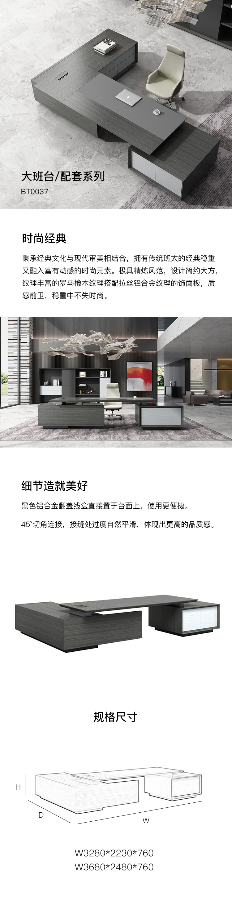 秉承经典文化与现代审美相结合,拥有传统班太的经典稳重 又融入富有动感的时尚元素。极具精炼风范,设计简约大方, 纹理丰富的罗马橡木纹理搭配拉丝铝合金纹理的饰面板,质 感前卫,稳重中不失时尚。