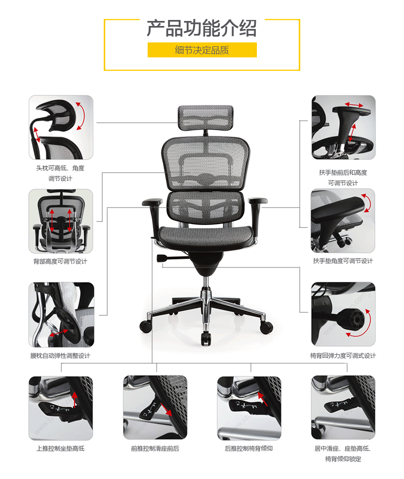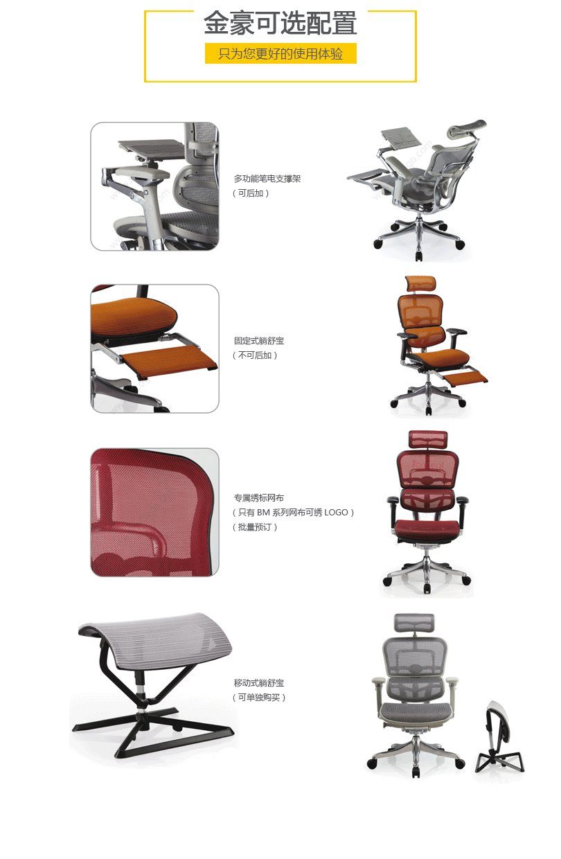 "金豪办公椅是一款符合人体工学的全功能性办公椅,力求使用者能充分理解其人性化的设计及达到最舒适的调节。