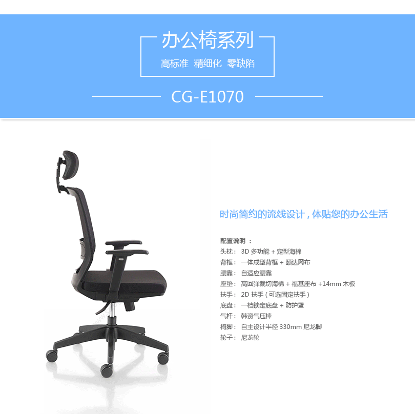 CG-E1070办公椅是一款符合人体工学的全功能性办公椅,力求使用者能充分理解其人性化的设计及达到最舒适的调节。