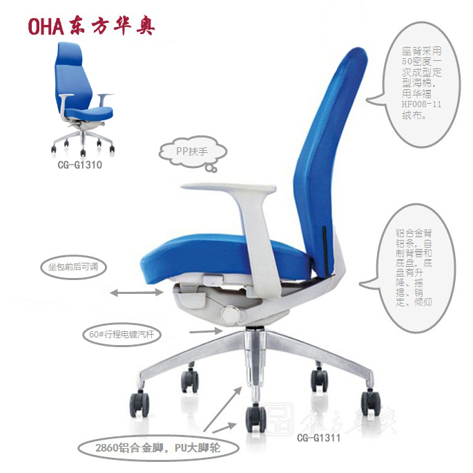 包有前后调节功能。座背采用50密度一次成型定型海棉,用华福HF008-11