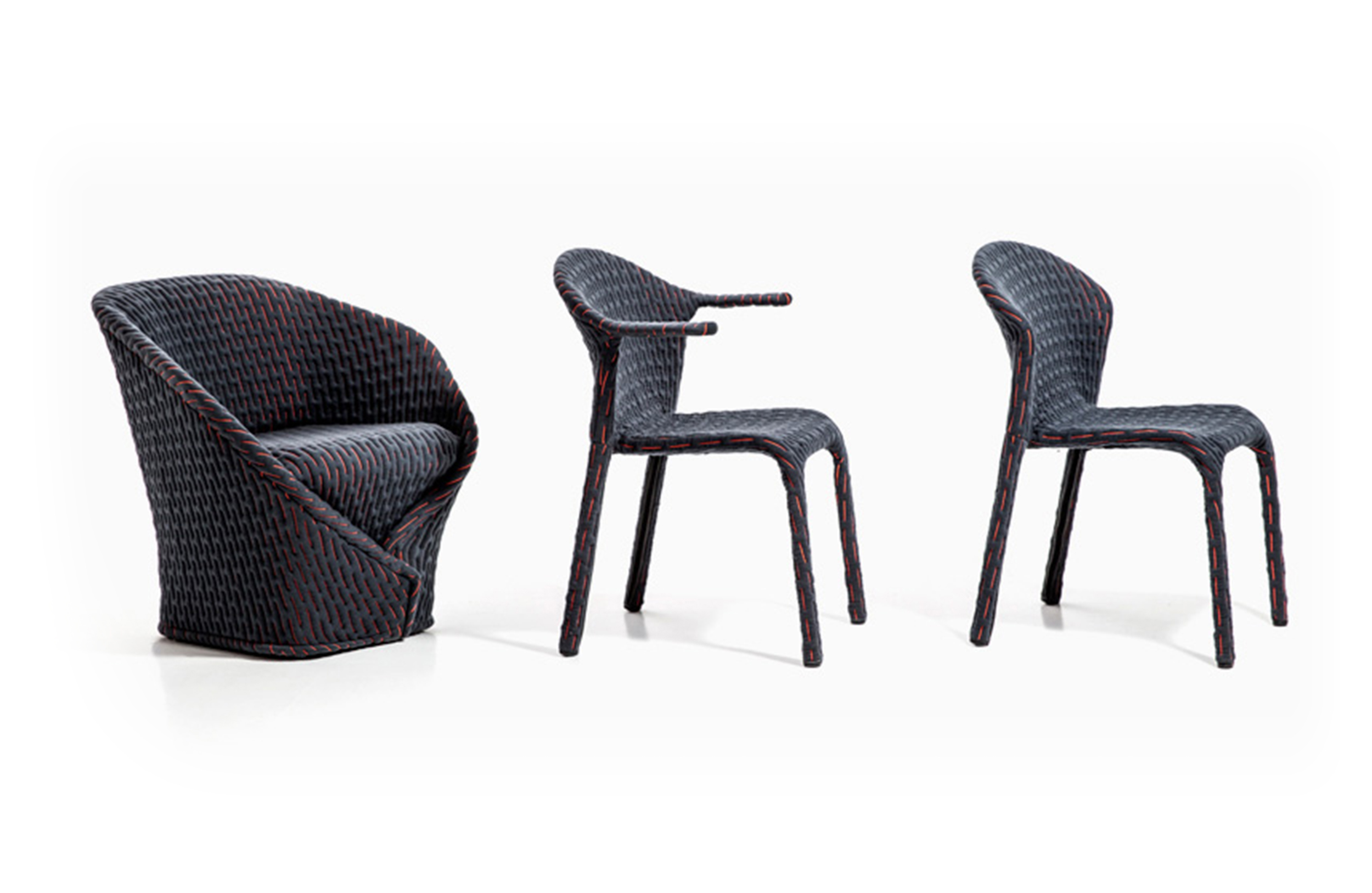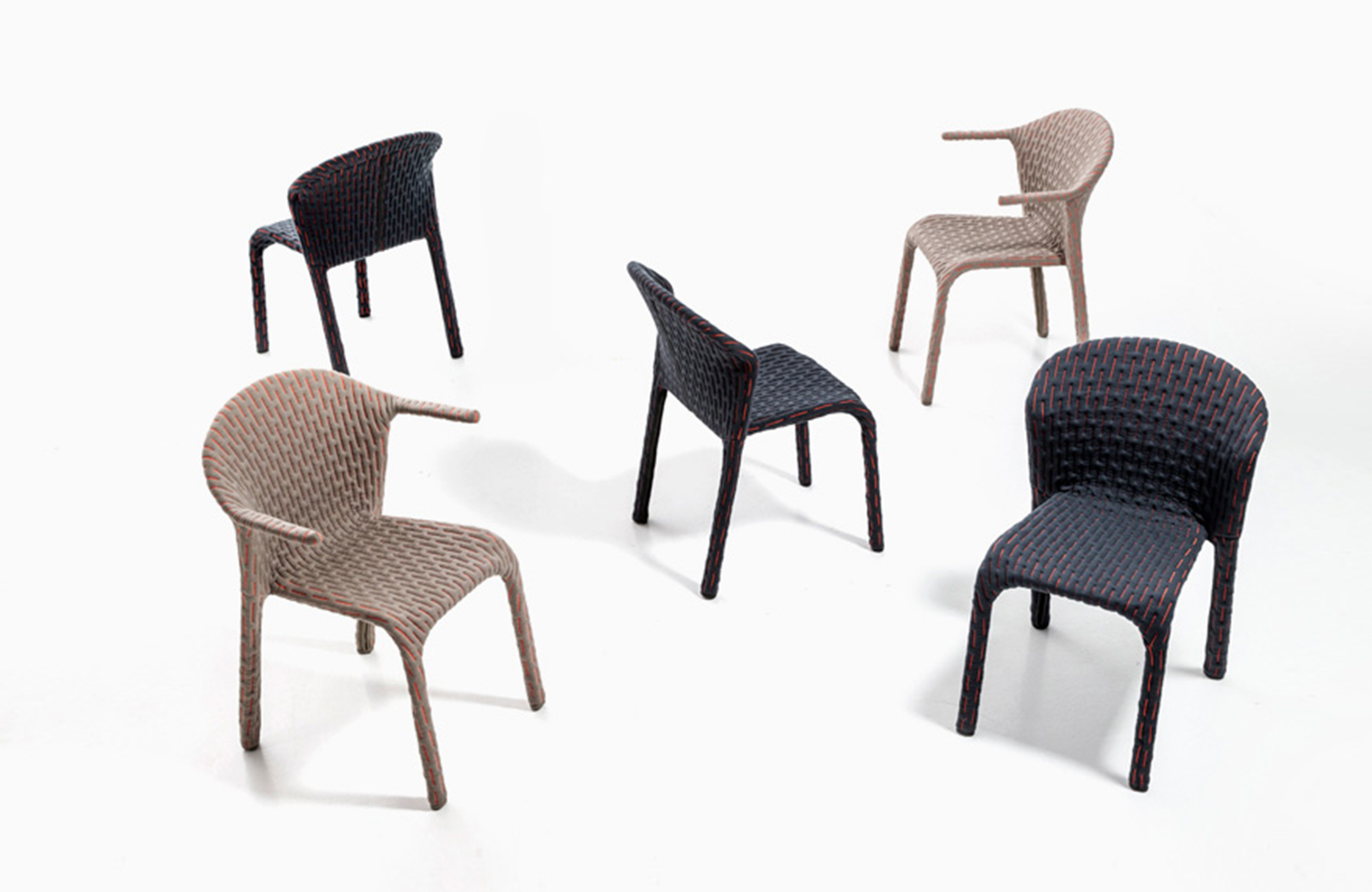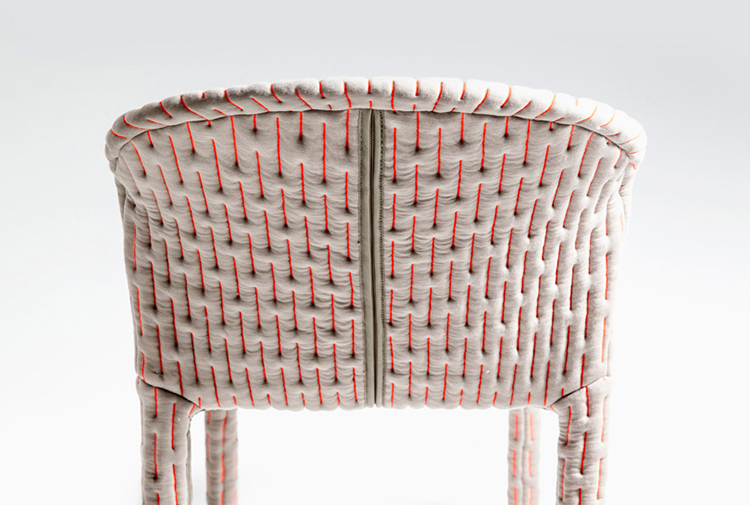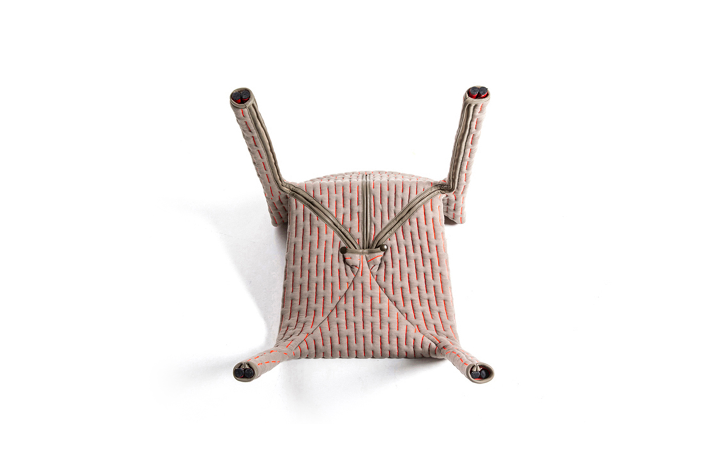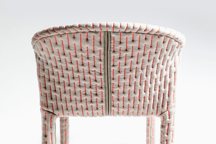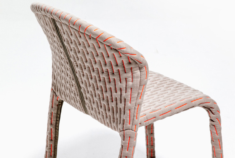 伪装成休闲椅的扶手椅,用他们的外表来控制空间。这主意很简单,用一件有衬垫的大衣盖住金属框架然后把它变成别的东西。一种非常直立的姿势,扶手的形状让人联想到双排扣外套的翻领,而这种相似之处就在中央扣扣上。室内装潢变成了衣服,可以在不过度的情况下,将赤裸的身体转变成一种追求自身内在同一性的物体。