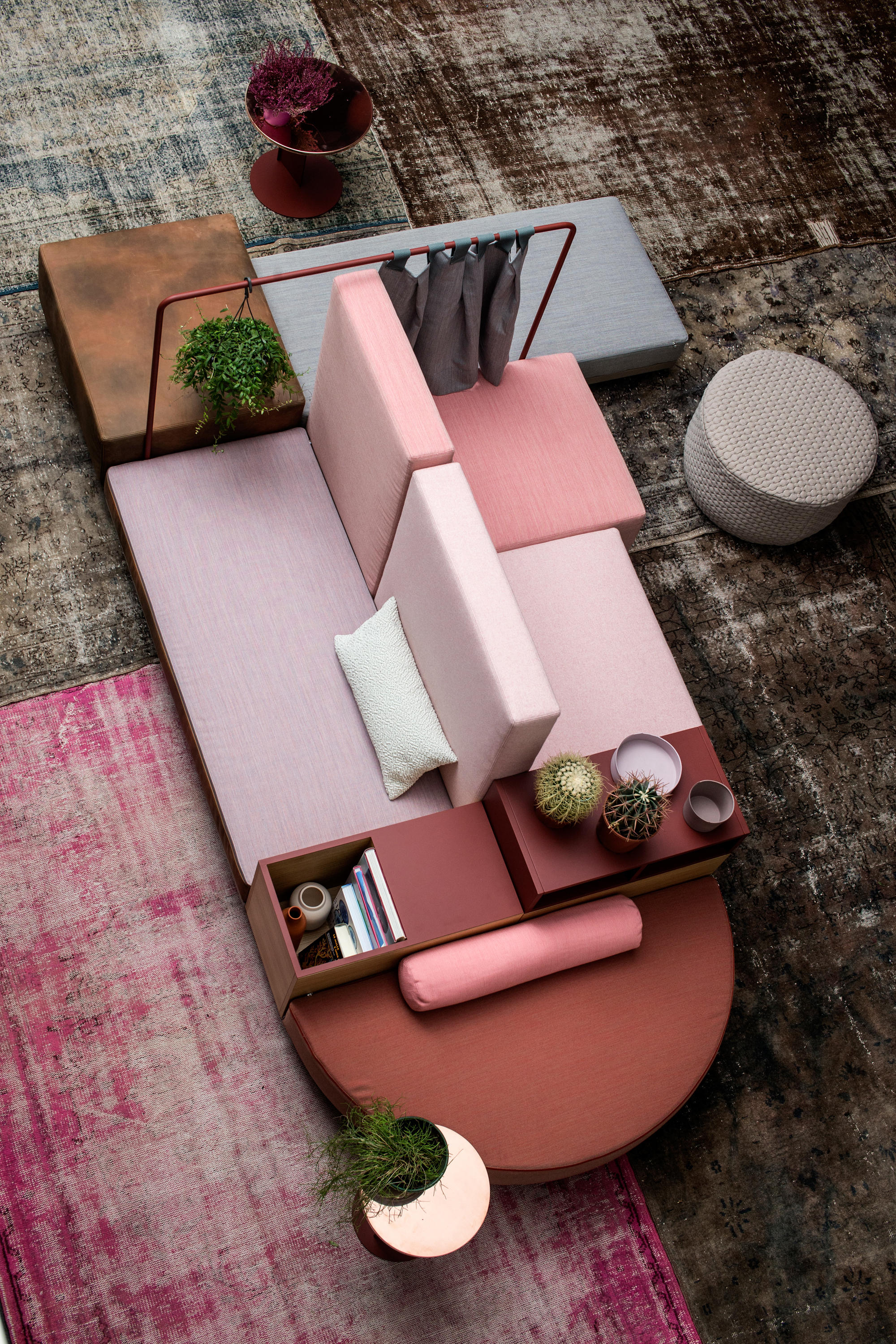 设计相互作用,轨迹控制空间。比基尼是一种风景,它是时代的产物,是它所代表的社会。无论是在等候区还是在家中使用,座位系统是绝对灵活的,因为不需要空间的布局和座位组件的排列。这些组件在外观和功能上各不相同,因此,它们可以在任何设置中使用。凳子、桌子、衣架、容器、架子、屏风、工作台、座椅:每一个元素都结合在一起,创造互动和交流。多种功能和含义的结合意味着沙发作为看电视的家具或简单的休息场所的概念发生了革命性的变化,使它成为互动的核心。