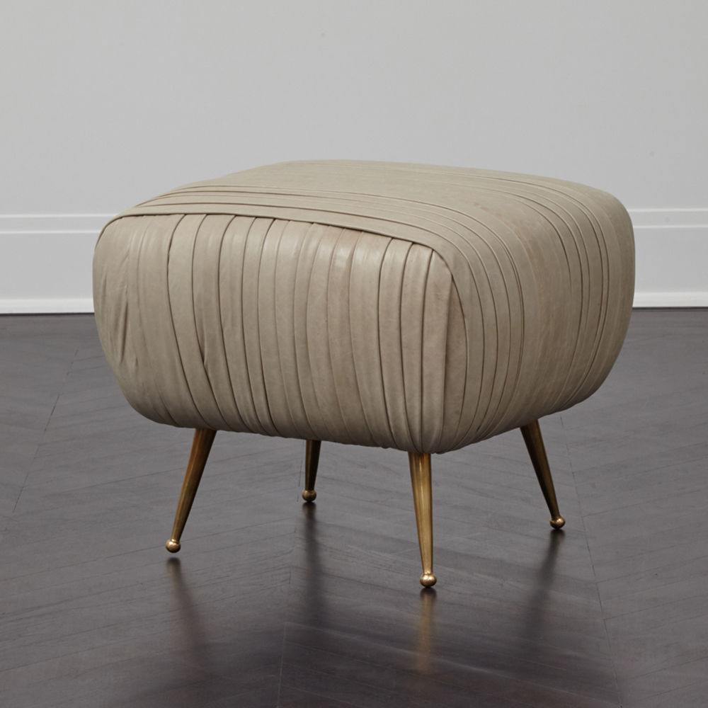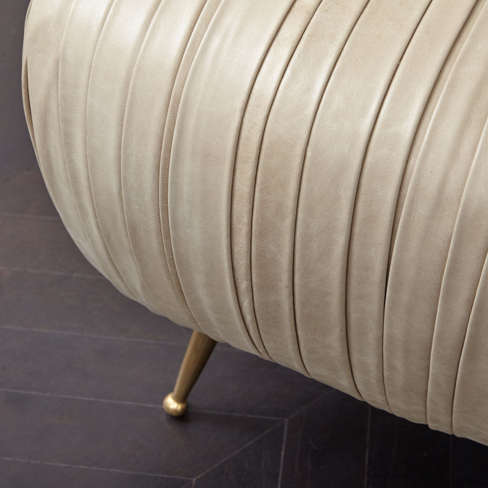 这款软垫的精致线条采用标志性褶皱皮革细节设计。 全面的蔬菜染色小羊皮手工缝制在框架上。 这款精致细腻的豪华矮凳坐落在坚固铸青铜的锥形腿上。 这是一个优雅的作品,小巧的比例,与舒芙蕾椅的完美搭配,或作为自己的声明。