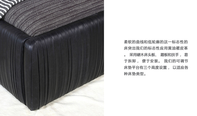 柔软的曲线和低轮廓的这一标志性的床突出我们的标志性应用黄油褶皮革。采用硬木床头板、踏板和扶手,易于拆卸,便于安装。我们的可调节床垫平台有三个高度设置,以适应各种床垫类型。 Souffle Bed从头到尾都由一位敬业的工匠装饰,是奢华、高品质和注重细节的典范。