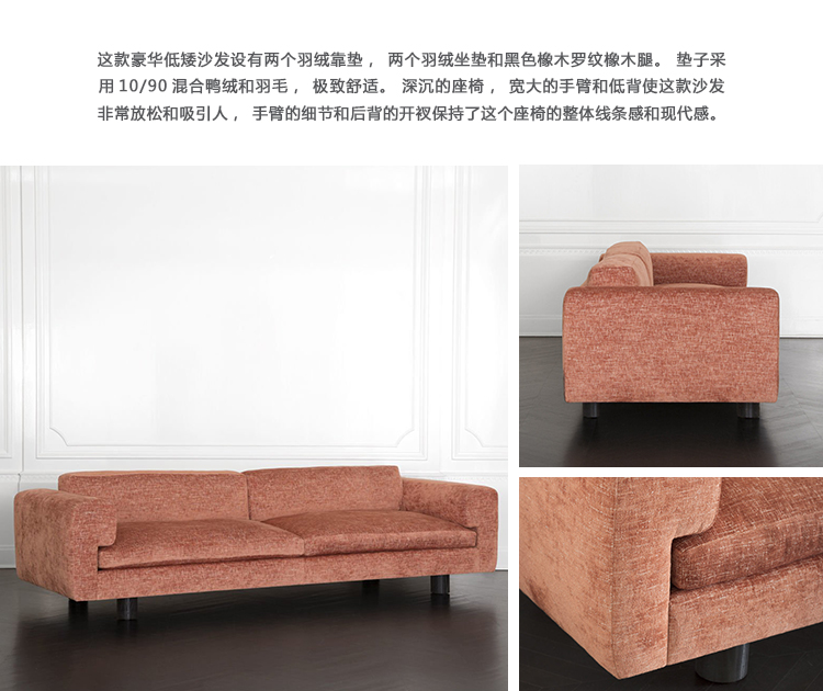 这款豪华低矮沙发设有两个羽绒靠垫,两个羽绒坐垫和黑色橡木罗纹橡木腿。 垫子采用10/90混合鸭绒和羽毛,极致舒适。 深沉的座椅,宽大的手臂和低背使这款沙发非常放松和吸引人,手臂的细节和后背的开衩保持了这个座椅的整体线条感和现代感。 提供精选面料和皮革。