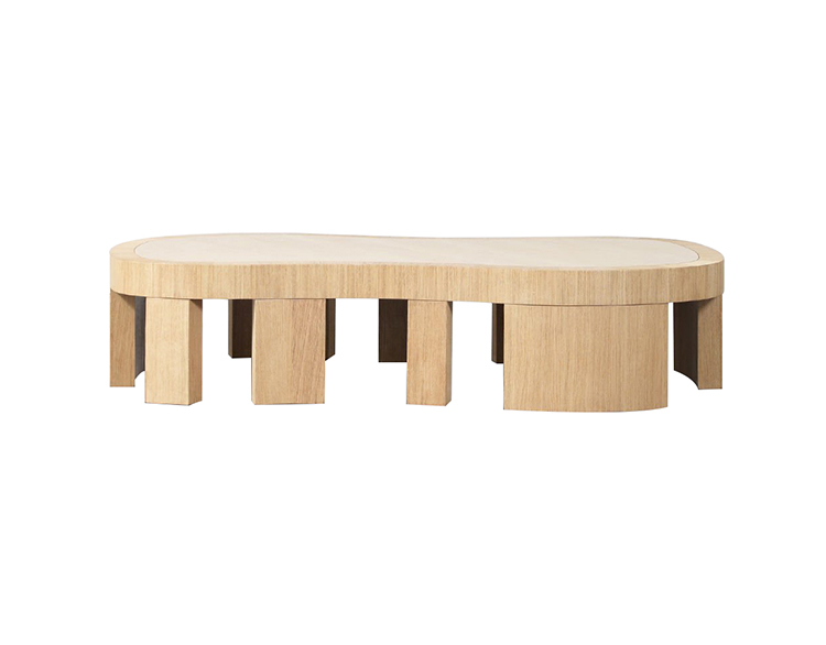 大胆的无定形罗德咖啡桌采用整体式黑檀木和拉丝橡木框架,与实心四分之一木质顶部和整体式腿部的光滑表面形成鲜明对比。