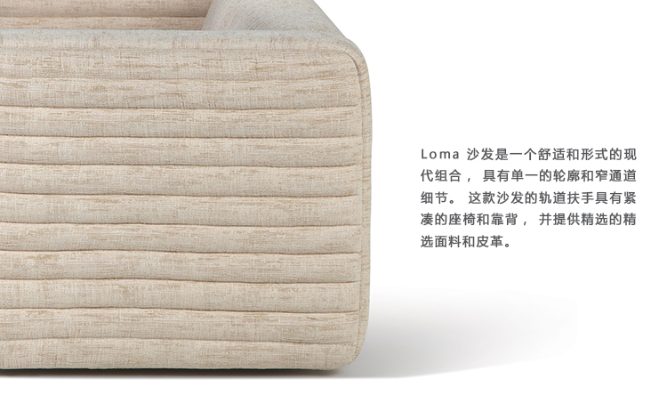 Loma Sofa(洛马沙发)是一个舒适和形式的现代组合,具有单一的轮廓和窄通道细节。 这款沙发的轨道扶手具有紧凑的座椅和靠背,并提供精选面料和皮革。