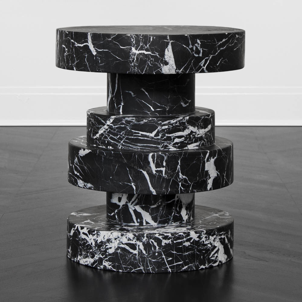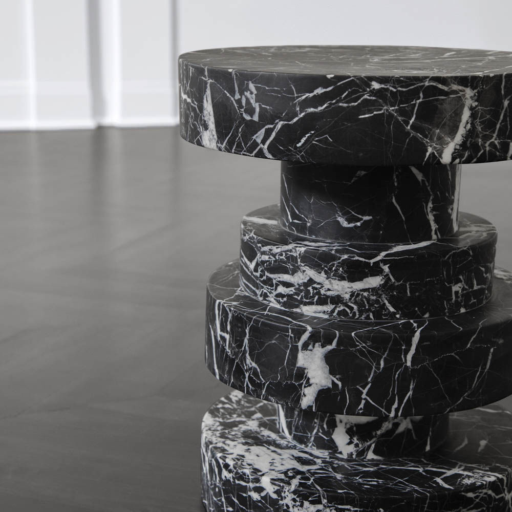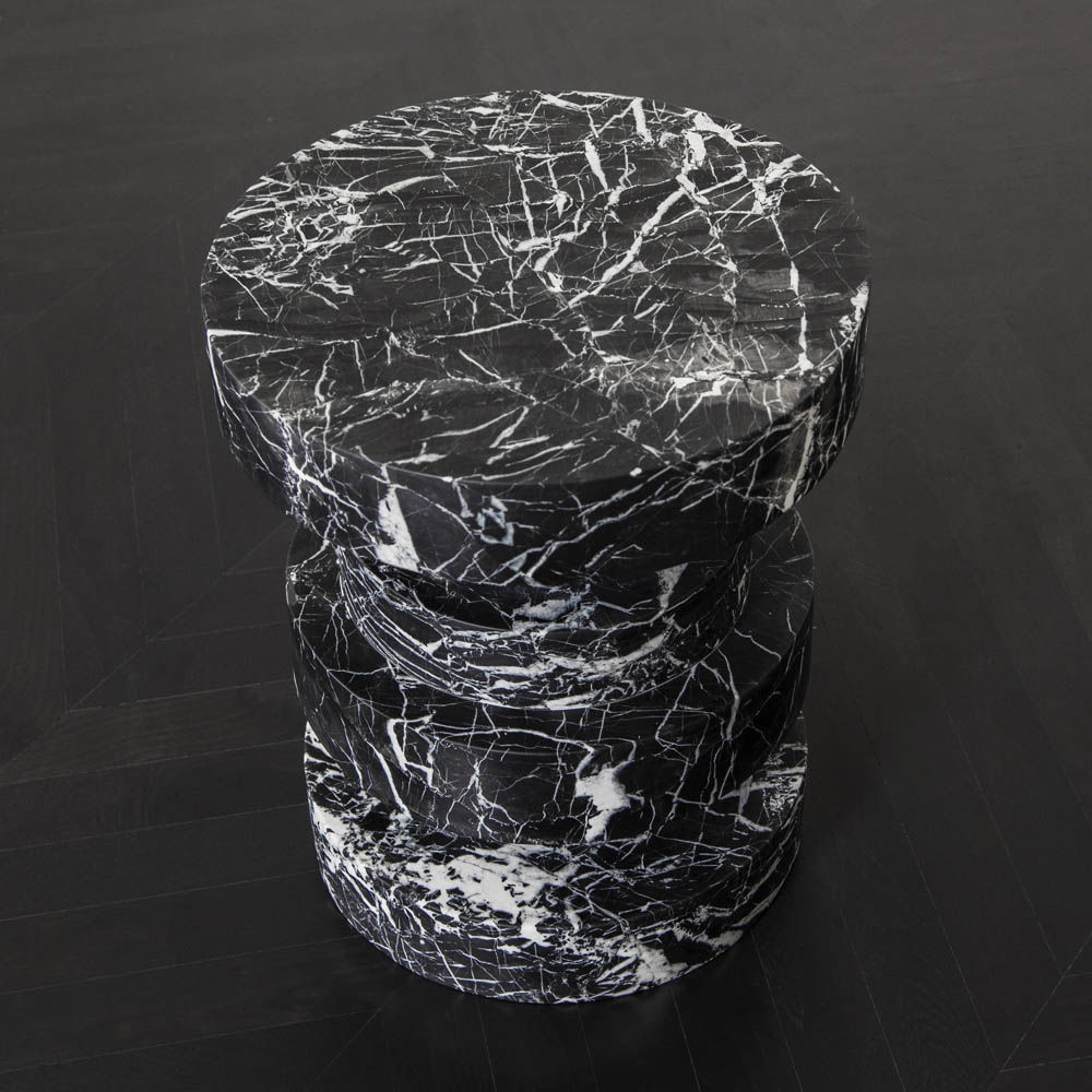 Apollo凳子,堆叠的大理石,非常适合户外或室内座位,鸡尾酒桌或边桌,或雕塑装饰件。 黑色大理石经过磨光和密封,以增加丰富感。