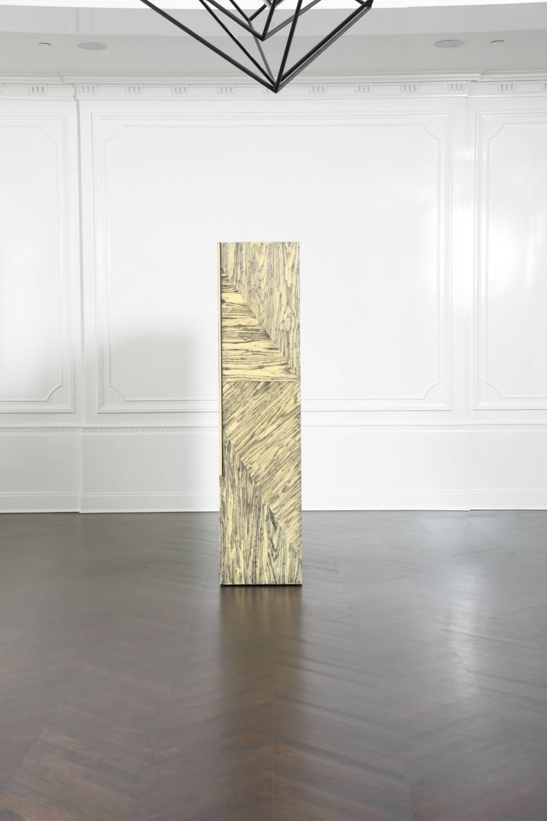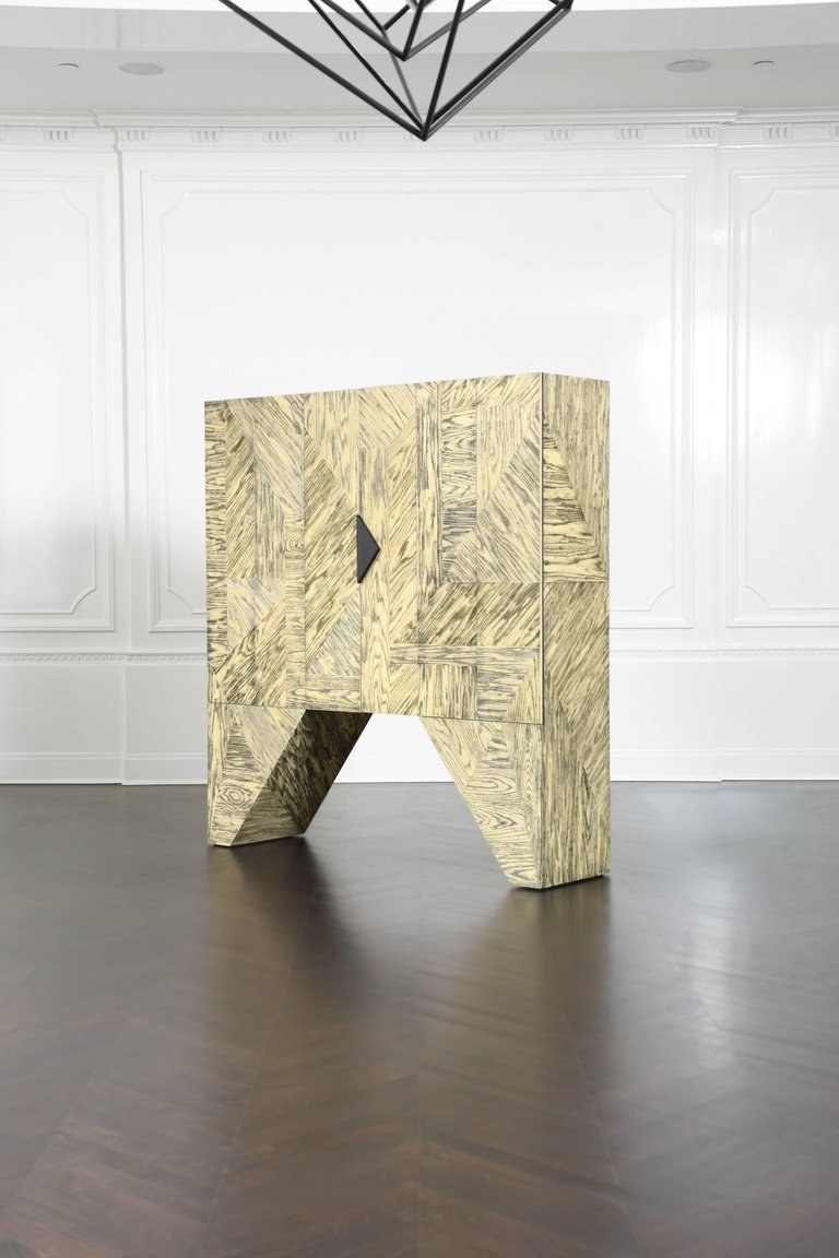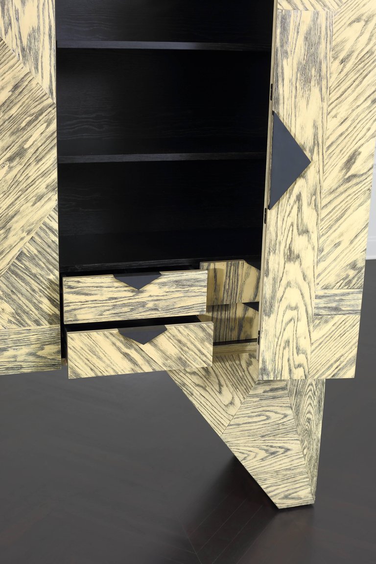 Esker柜是一个图形和现代的存储或媒体显示的选择。这个棱角分明的轮廓是由淡黄色和黑色的橡木切割而成。对比鲜明的污渍,随机定向的镶板,和橡木的纹理运动结合在一起,最大限度的视觉冲击。在Z折叠门后面,室内提供了8个内衬抽屉,黑色的钢五金件和两对可移动的实木架子。