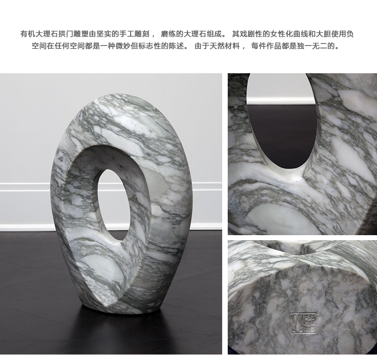 有机大理石拱门雕塑由坚实的手工雕刻,磨练的大理石组成。 其戏剧性的女性化曲线和大胆使用负空间在任何空间都是一种微妙但标志性的陈述。 由于天然材料,每件作品都是独一无二的。