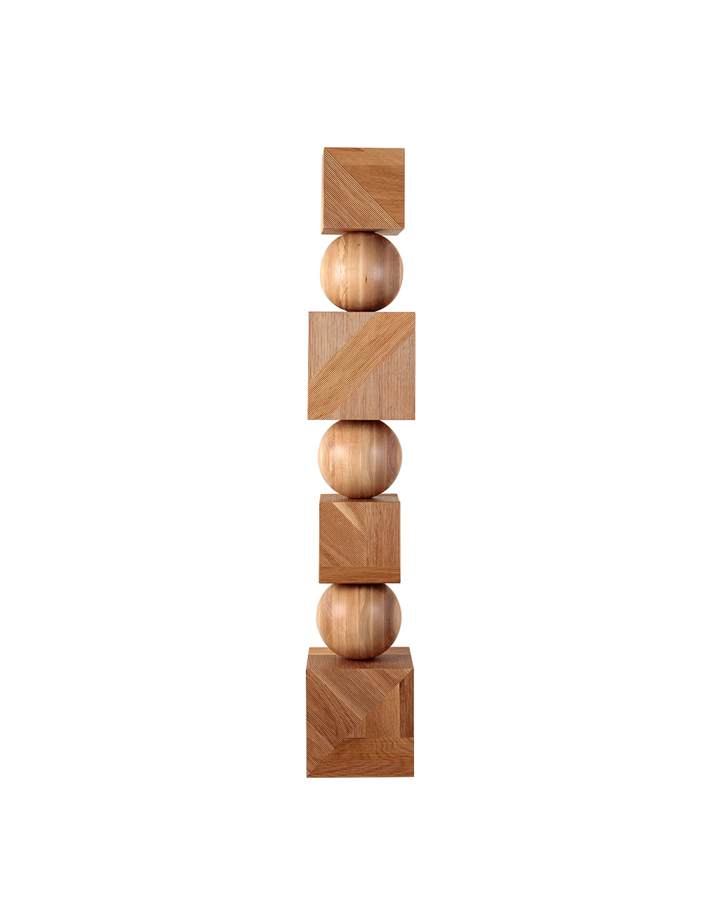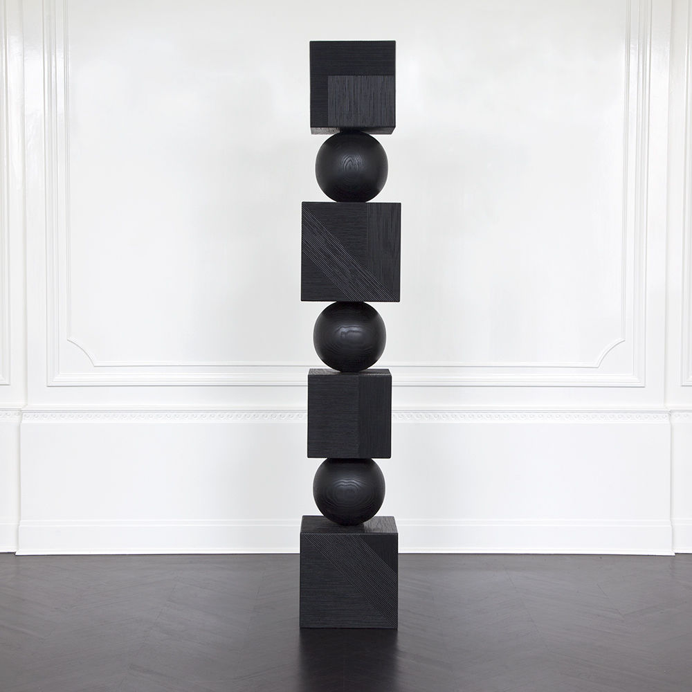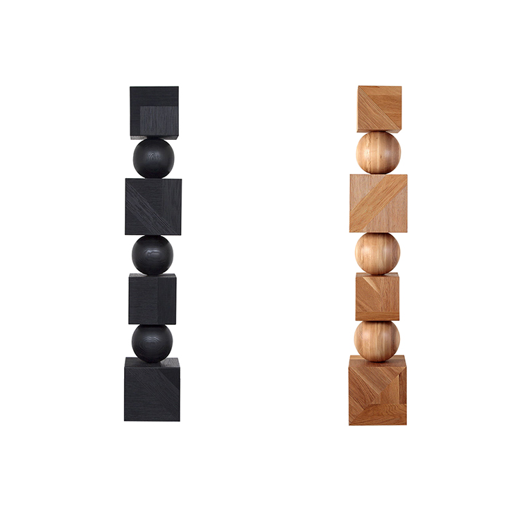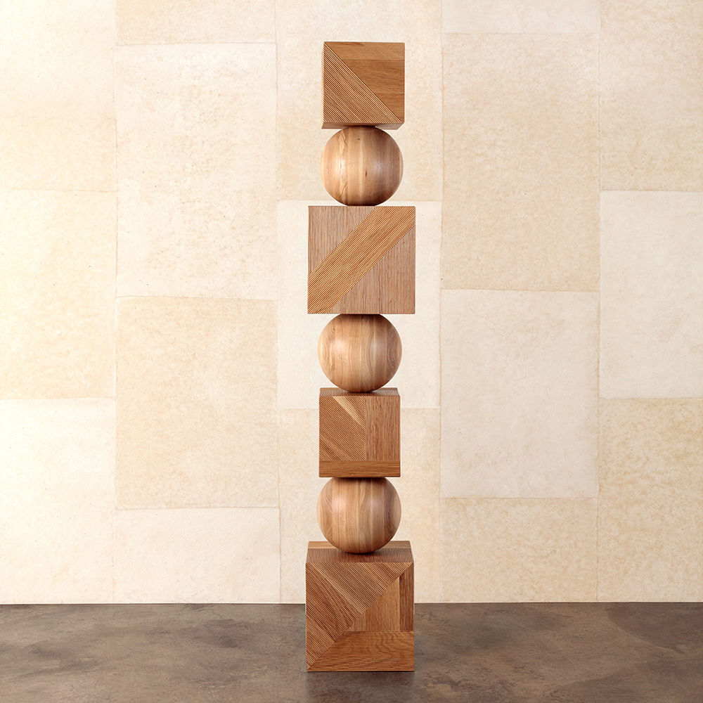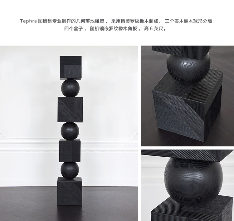 Tephra图腾是专业制作的几何落地雕塑,采用精美罗纹橡木制成。 三个实木橡木球形分隔四个盒子,随机镶嵌罗纹橡木角板,高6英尺。 这些戏剧性的艺术品均由工匠木工手工制作而成。 有天然和乌木饰面可供选择。