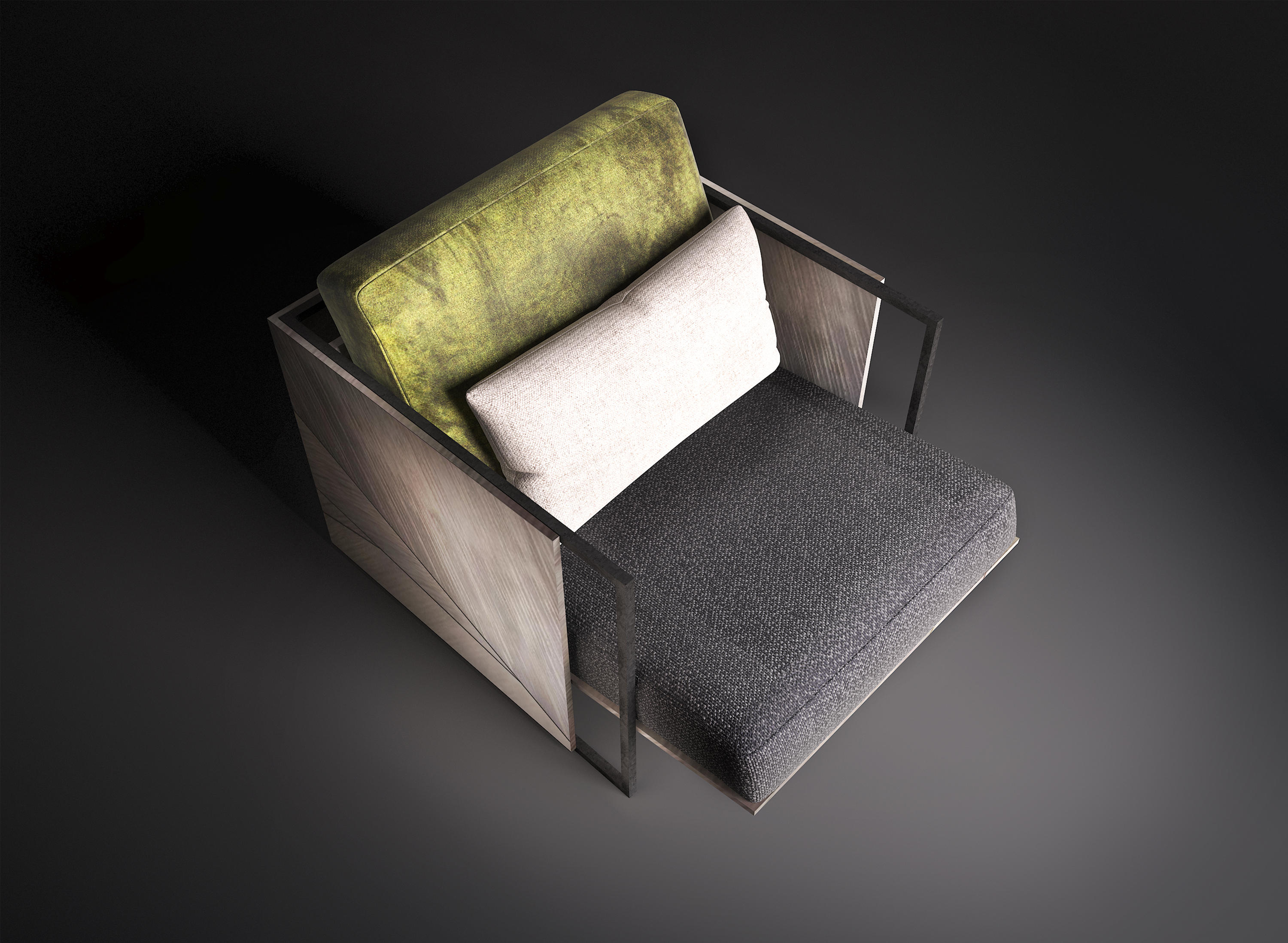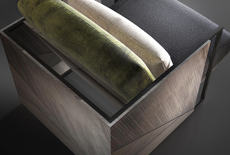 柔和的木质框架和这款杰出扶手椅的古铜色钢饰边完美地结合了舒适和保护,而座椅的倾斜度提供了极佳的靠背支撑。座椅和两个作为靠背的坐垫采用优质面料或优质皮革,配以绿色、白色和深灰色。