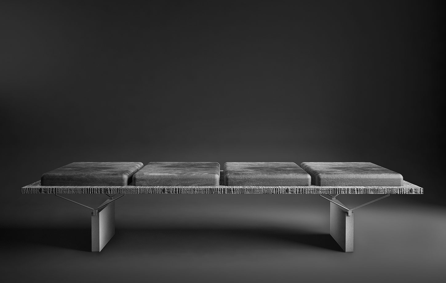 一个“没有多余装饰”的长椅,但却无法实现:通过在绒面革的柔软度和厚厚的蓝色垫子之间展现色彩,Stamford使原木座椅高贵。 薄的关节支撑着座椅,而抛光的金属腿为家具增添了优雅和轻盈。