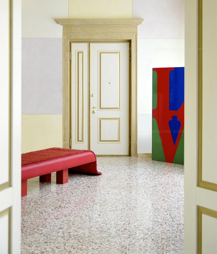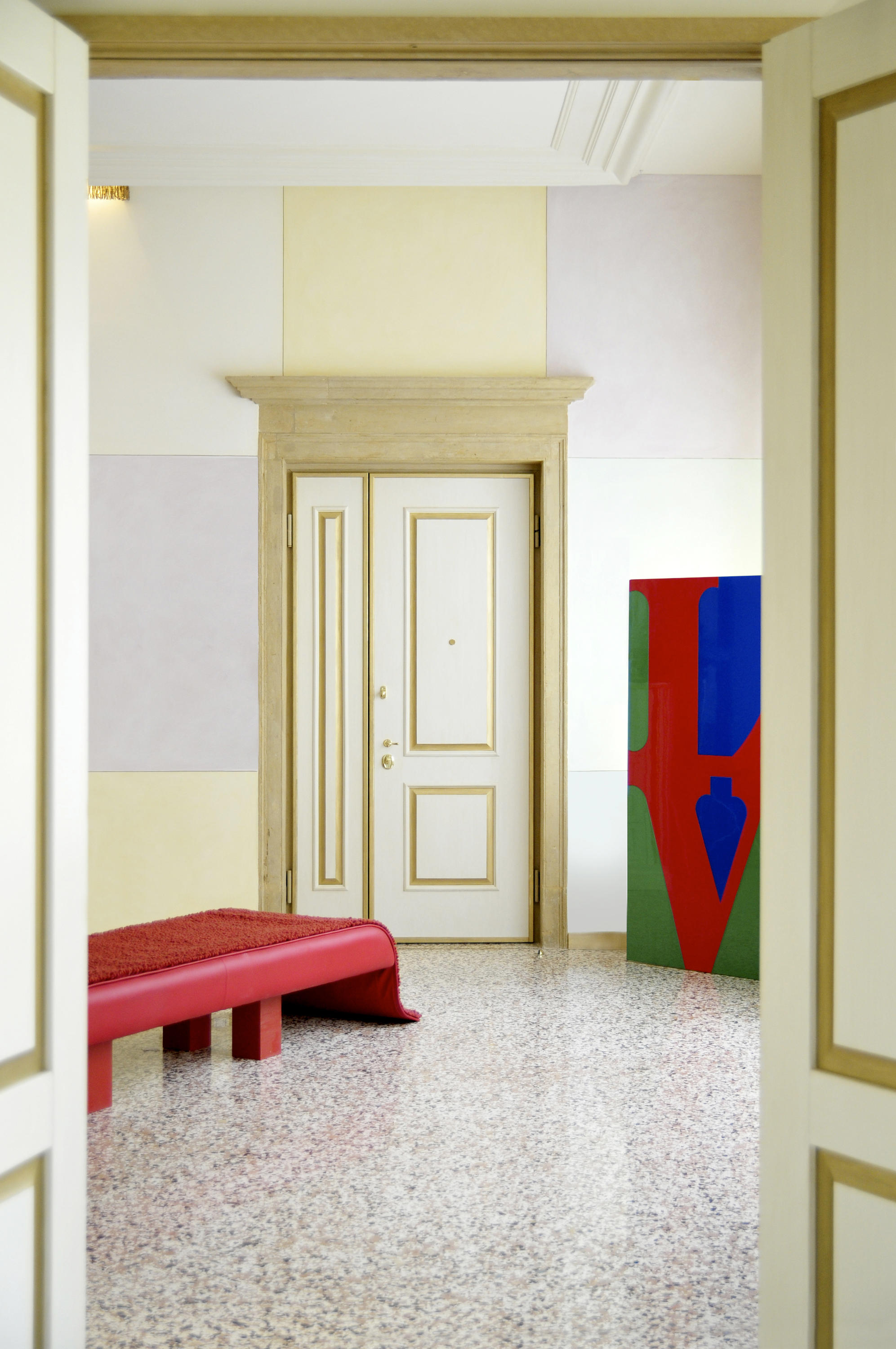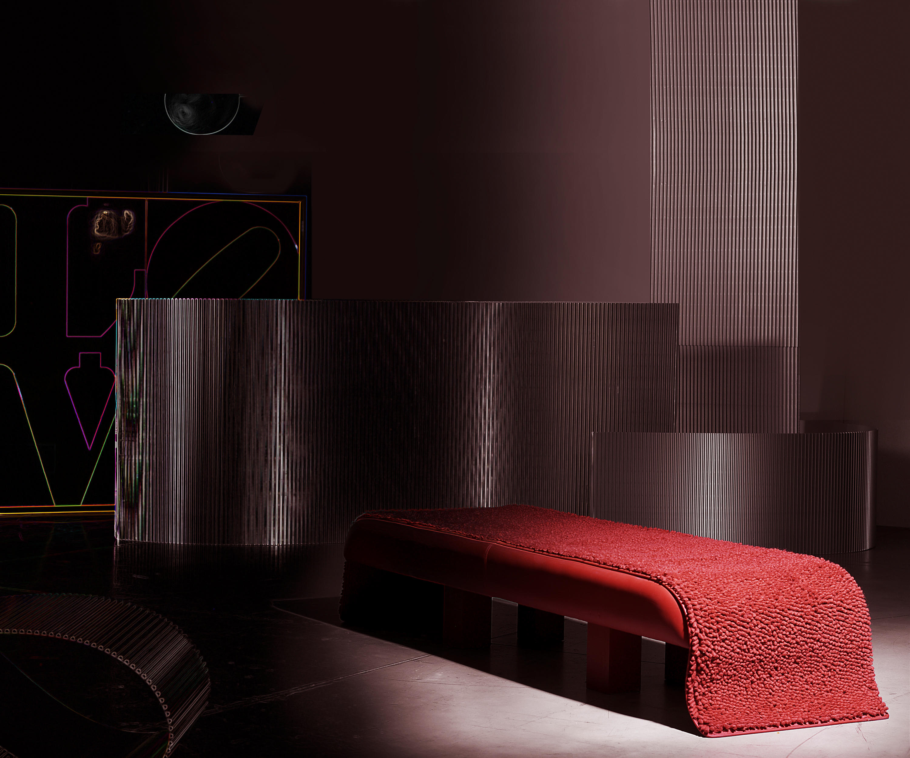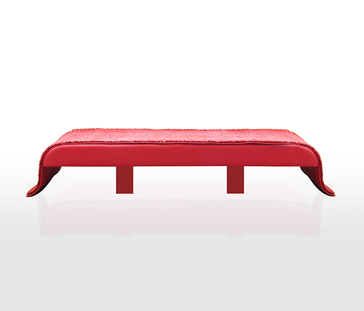 奇特的红色Tappeto Volante长椅采用哑光漆实木结构,膨胀的高容量和变密度聚氨酯填充红色皮革覆盖和上垫覆盖在可拆卸的羊毛内衬。