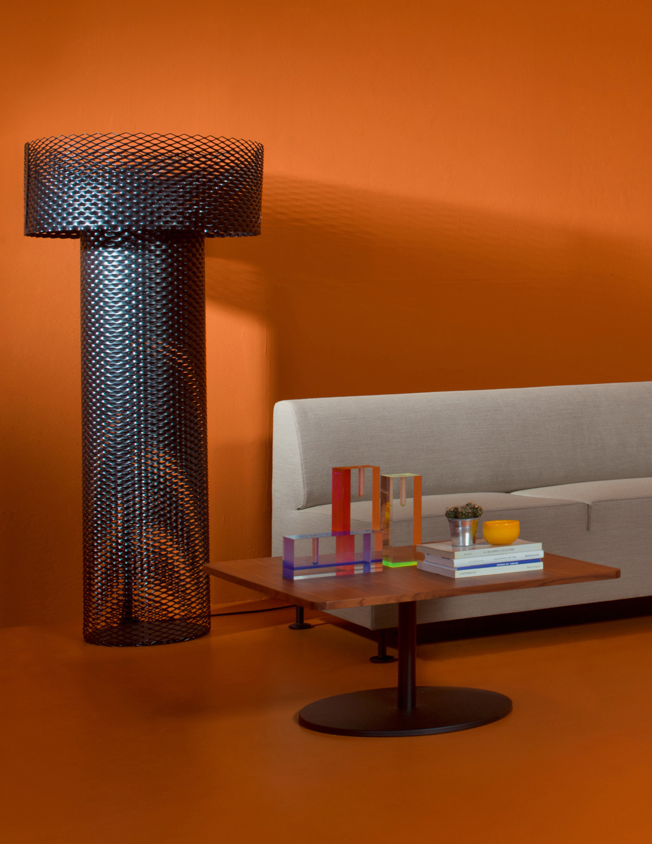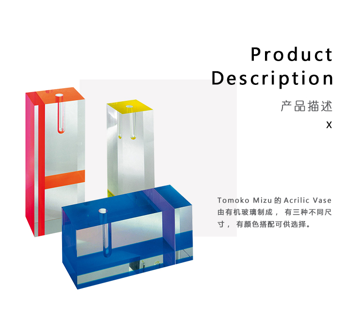 Tomoko Mizu的Acrilic Vase由有机玻璃制成,有三种不同尺寸,有颜色搭配可供选择。 透明饰面搭配彩色插页,营造出具有明显几何风格的装饰:红色/橙色,荧光黄色和蓝色/紫色。