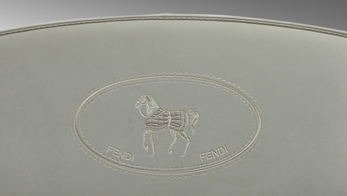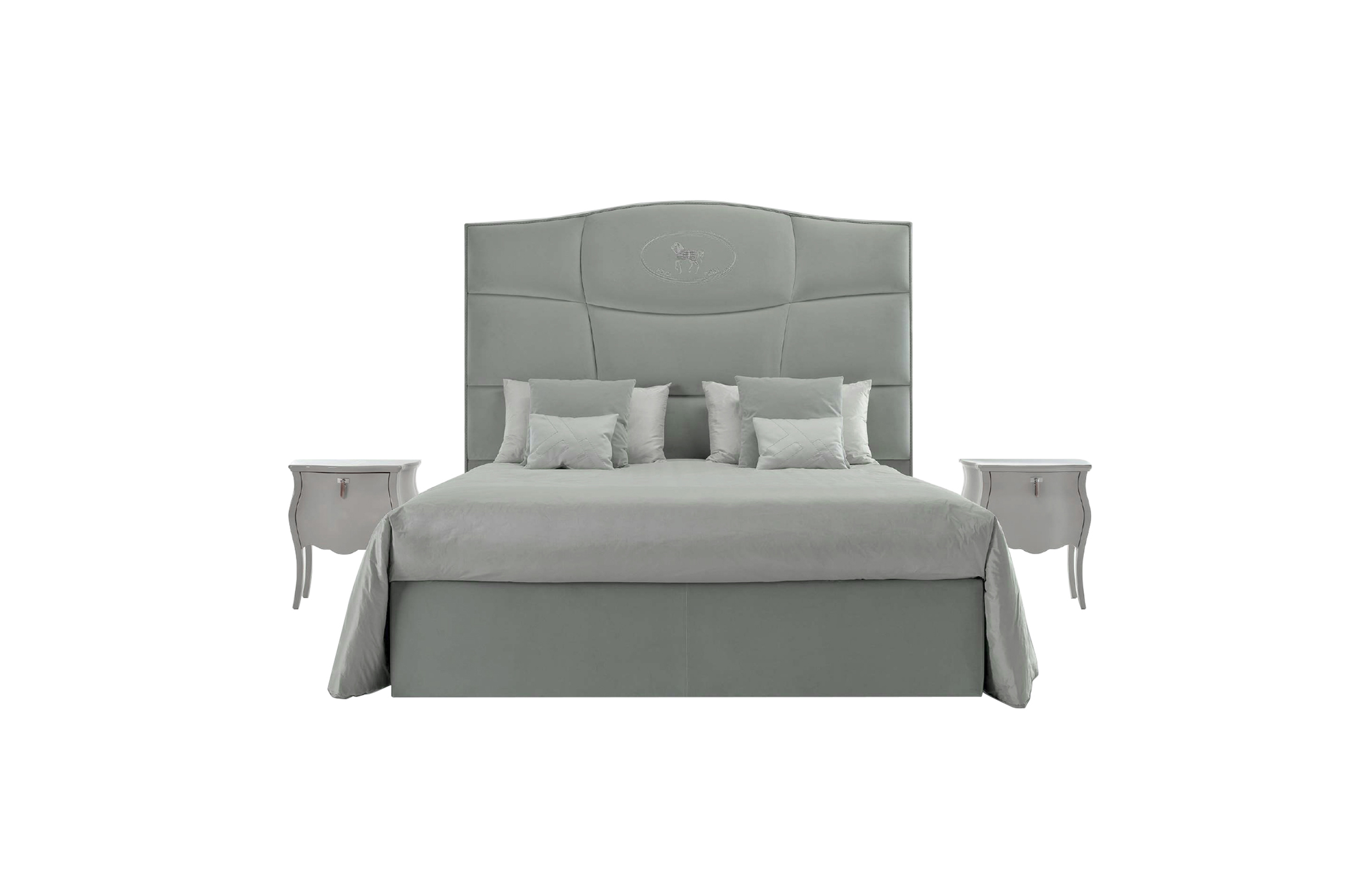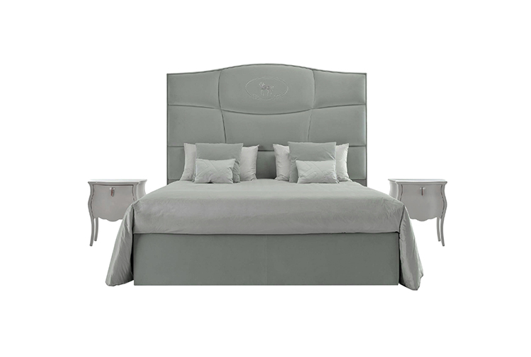 Sumptuous volumes and important dimensions for the new George bed caratherizied by its imposing headboard, finely handcrafted with motif made up of irregular squares arranged in a linear pattern. The soft upholstery is enhanced in the central part by the iconic Villa Borghese embroidery.