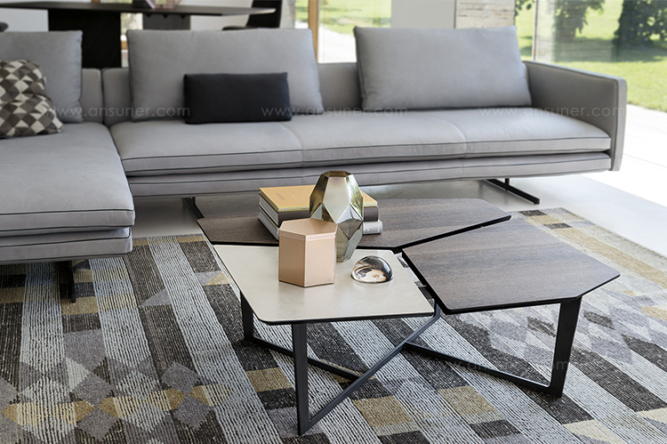 纳尔逊咖啡桌的主要特点是它的桌面。桌面被一个很深的缝隙分开但它们是由结构组成的。将木头和皮革等温暖的材料结合在一起组合成了不规则的几何形状的桌面。托斯卡纳传统的蔬菜鞣革是一种以多种颜色、独特香气和小瑕疵为特点的天然产物。