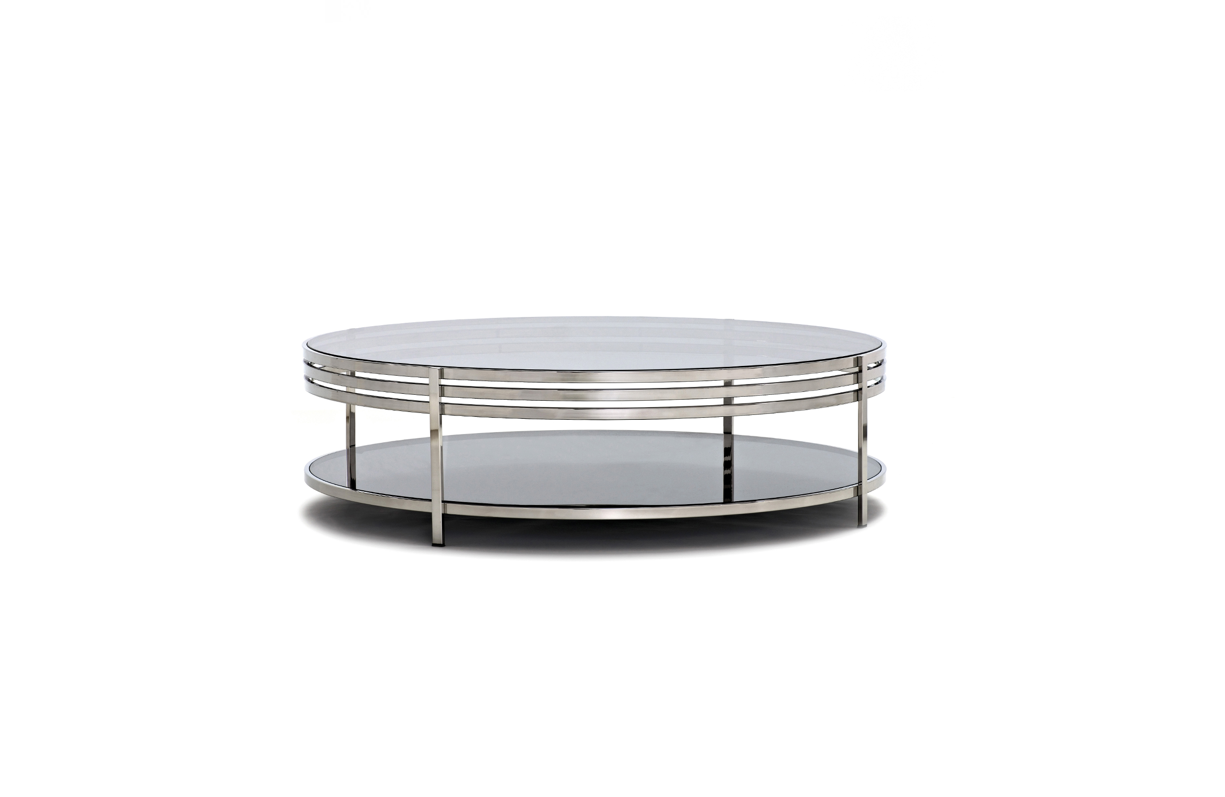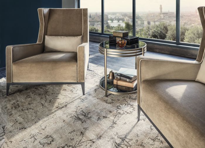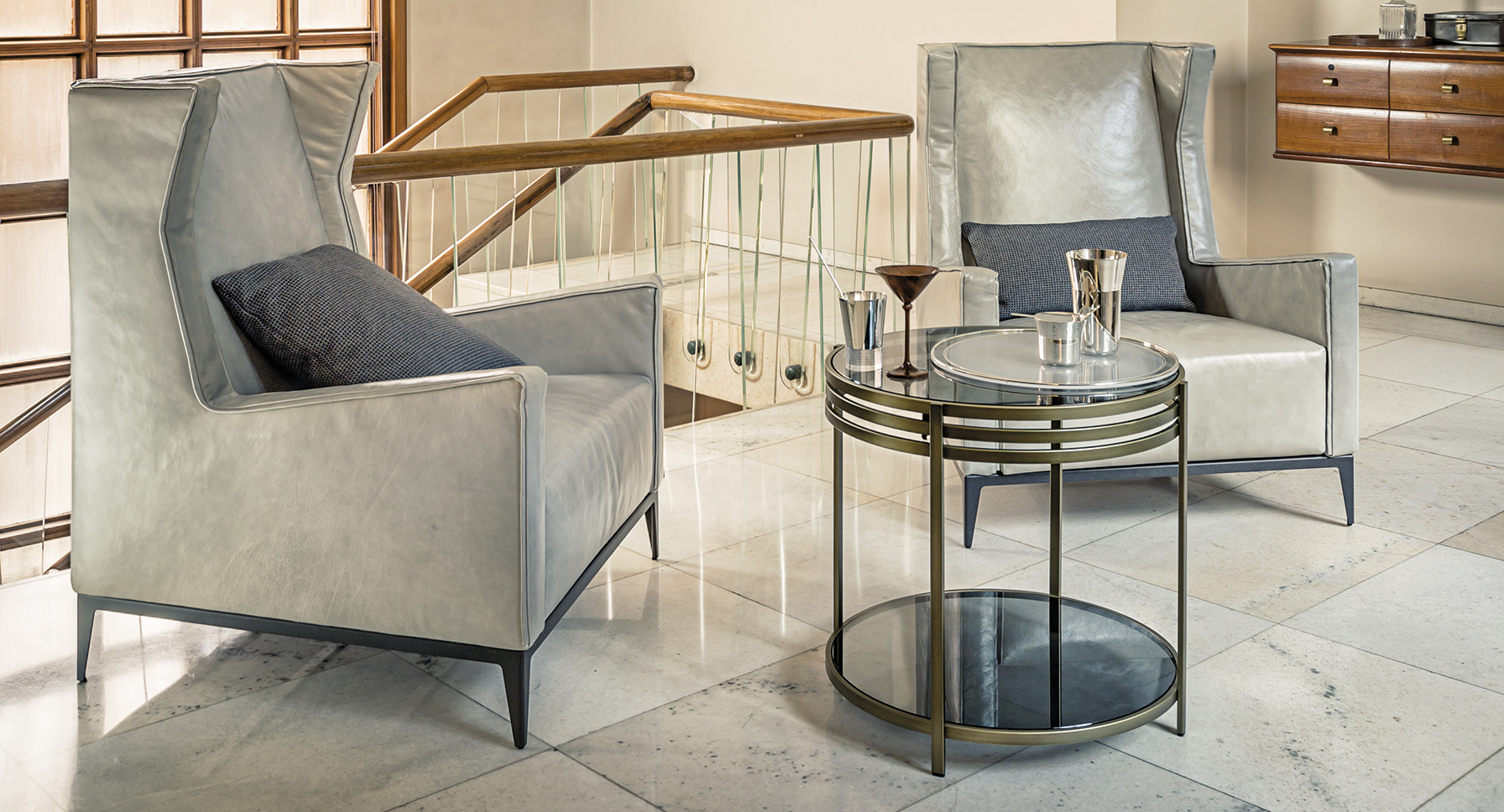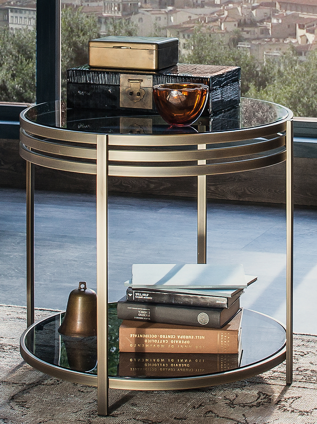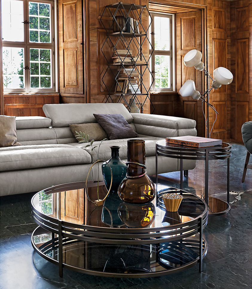 一系列的小桌子,突出了优雅的结构,用抛光的不锈钢或黄铜制成,并以温和的烟熏玻璃为顶部。