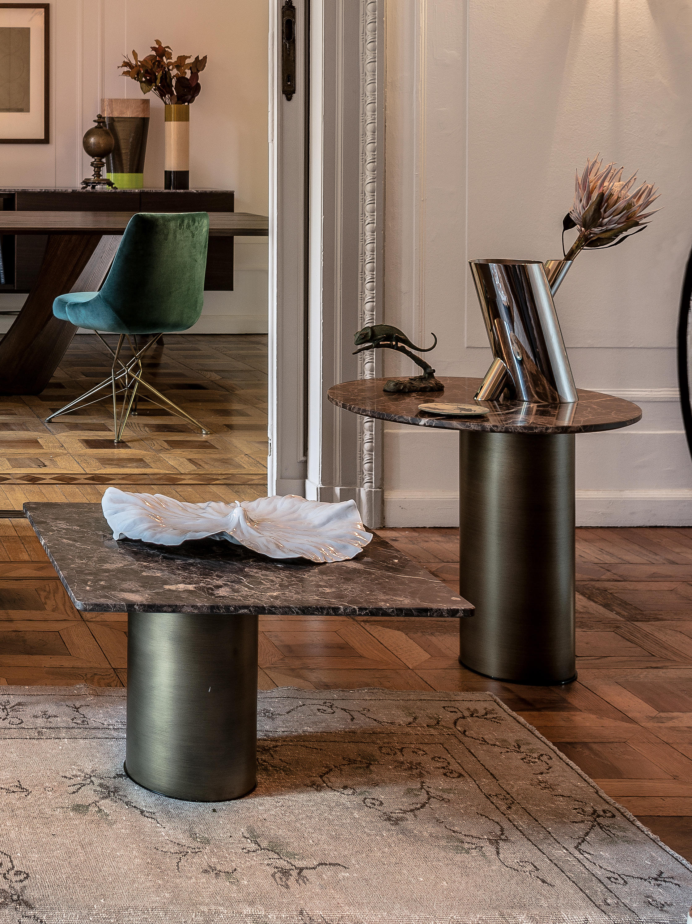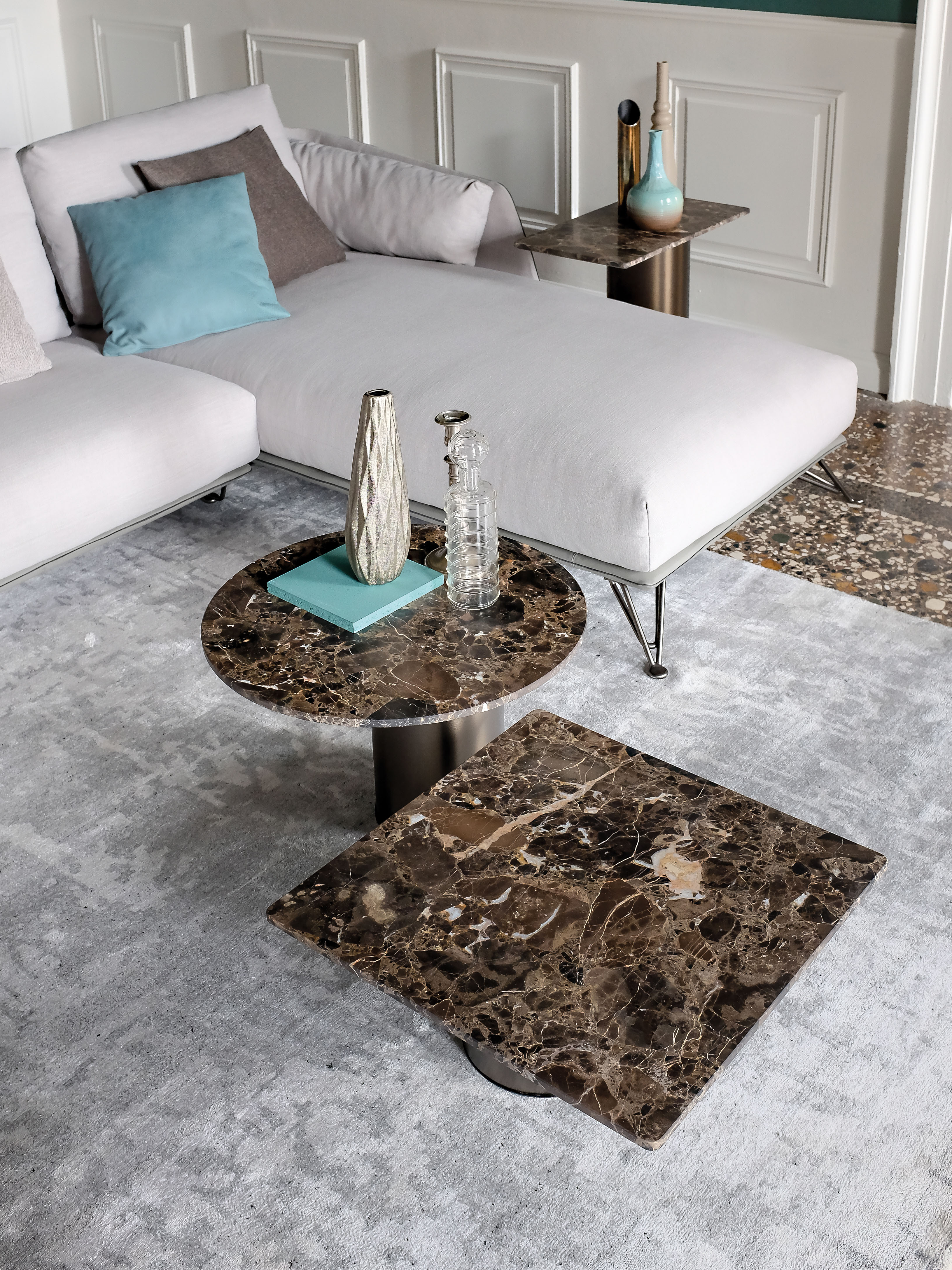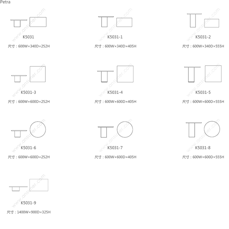 两种不同的材料结合在一个咖啡桌上。Petra咖啡桌被设计为可以当成单独的桌子或作为一套桌子进行使用。底座的设计是偏离桌面中心的,多款桌子因不同的高度搭配在一起创造了一个起伏的桌面效果。桌面有圆形和矩形可供用户进行选择。