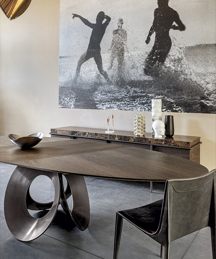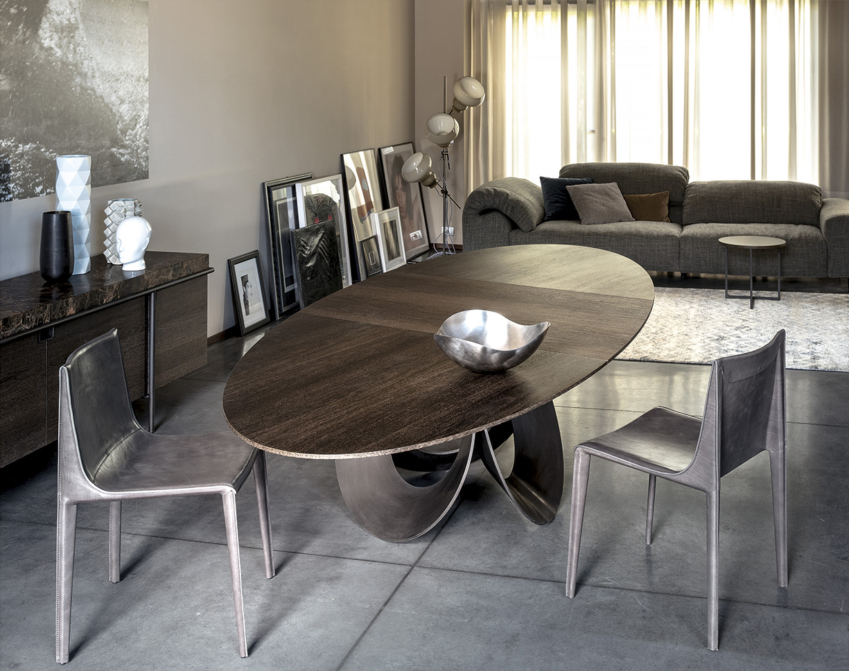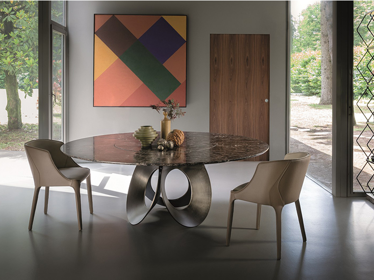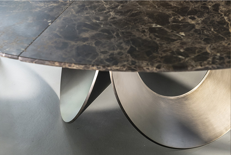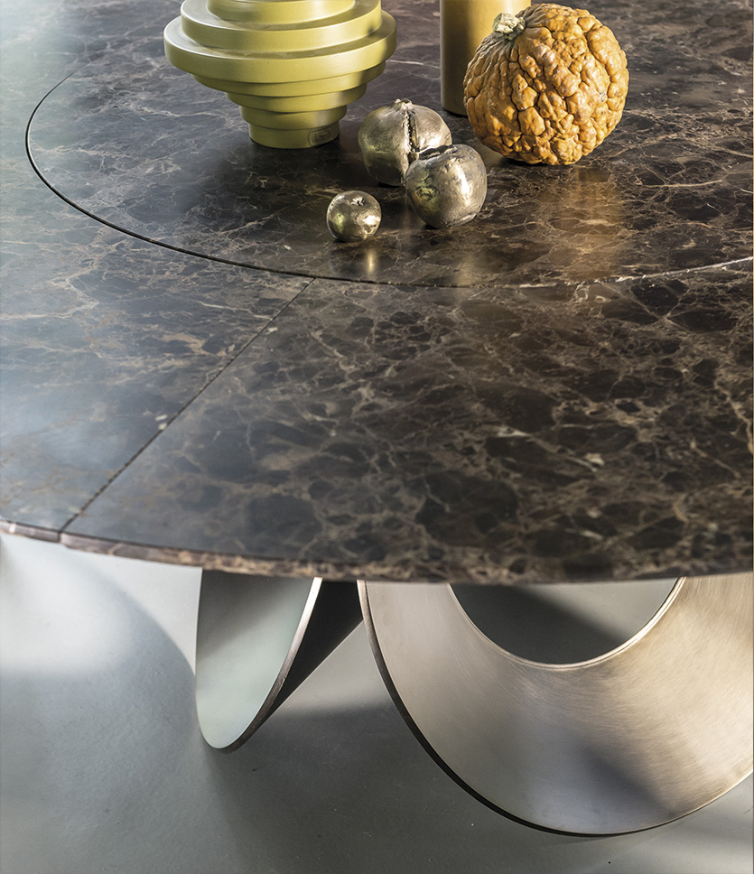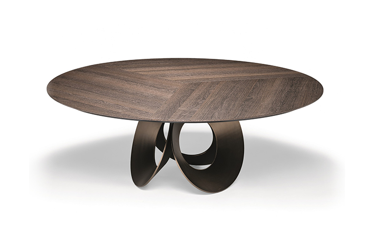 由吉诺·卡罗罗(Gino Carollo)设计的Oracle餐桌是圆形的几何形状,是完美的象征。家具的形状表现出整体性和中心性。圆形或椭圆形的桌面是由MDF镶嵌在莫卡橡木或柚檀木上。直径为200CM的桌面也可以使用啡网纹大理石桌面。它独特的底座就像生命之花的构造:三个重叠的圆圈,似乎围绕着一个点旋转。该金属的底座可用云母棕色、黄铜、钛或新草灰色抛光。