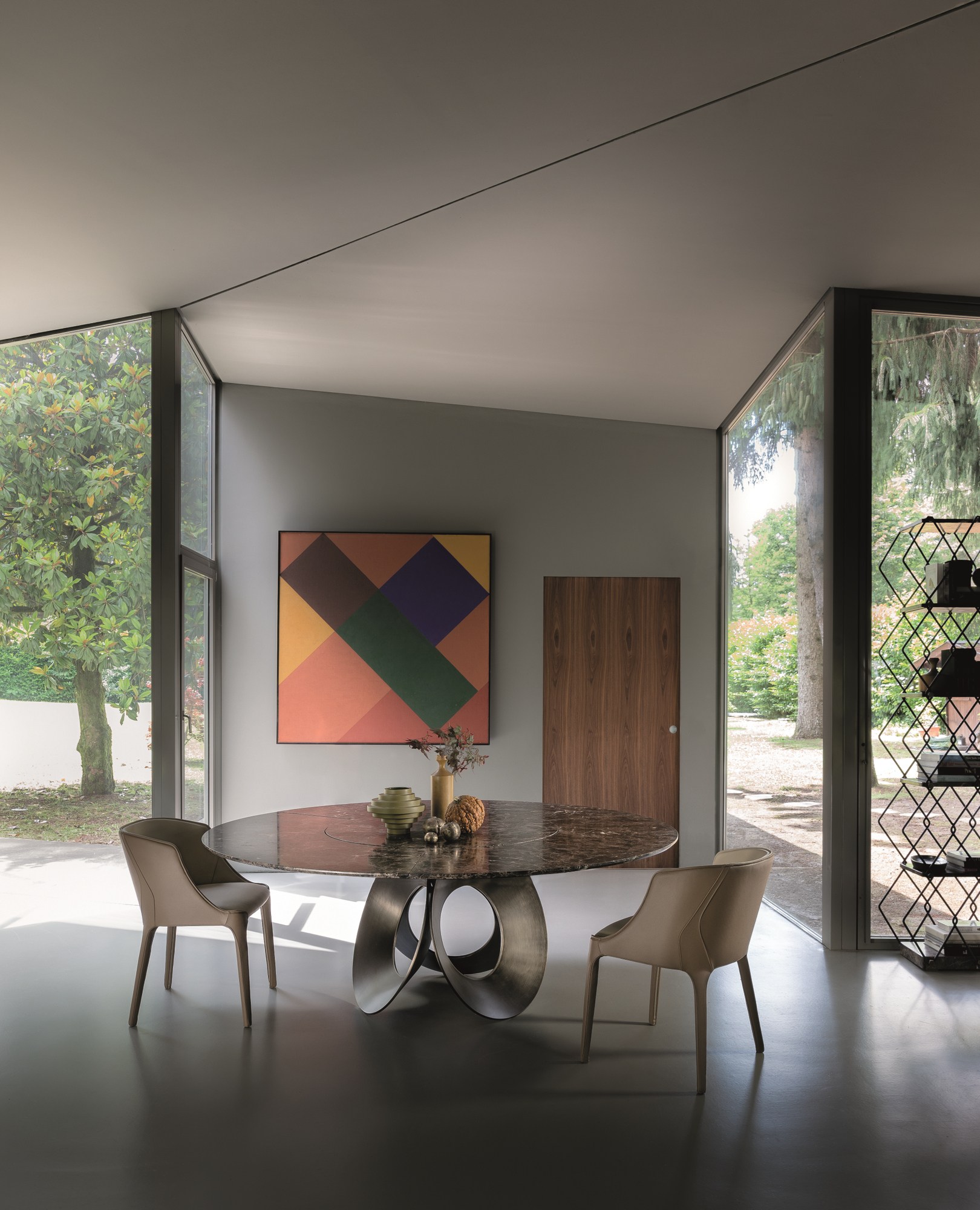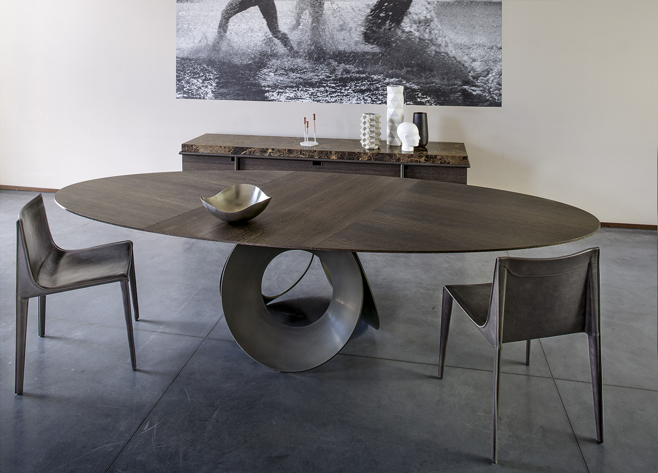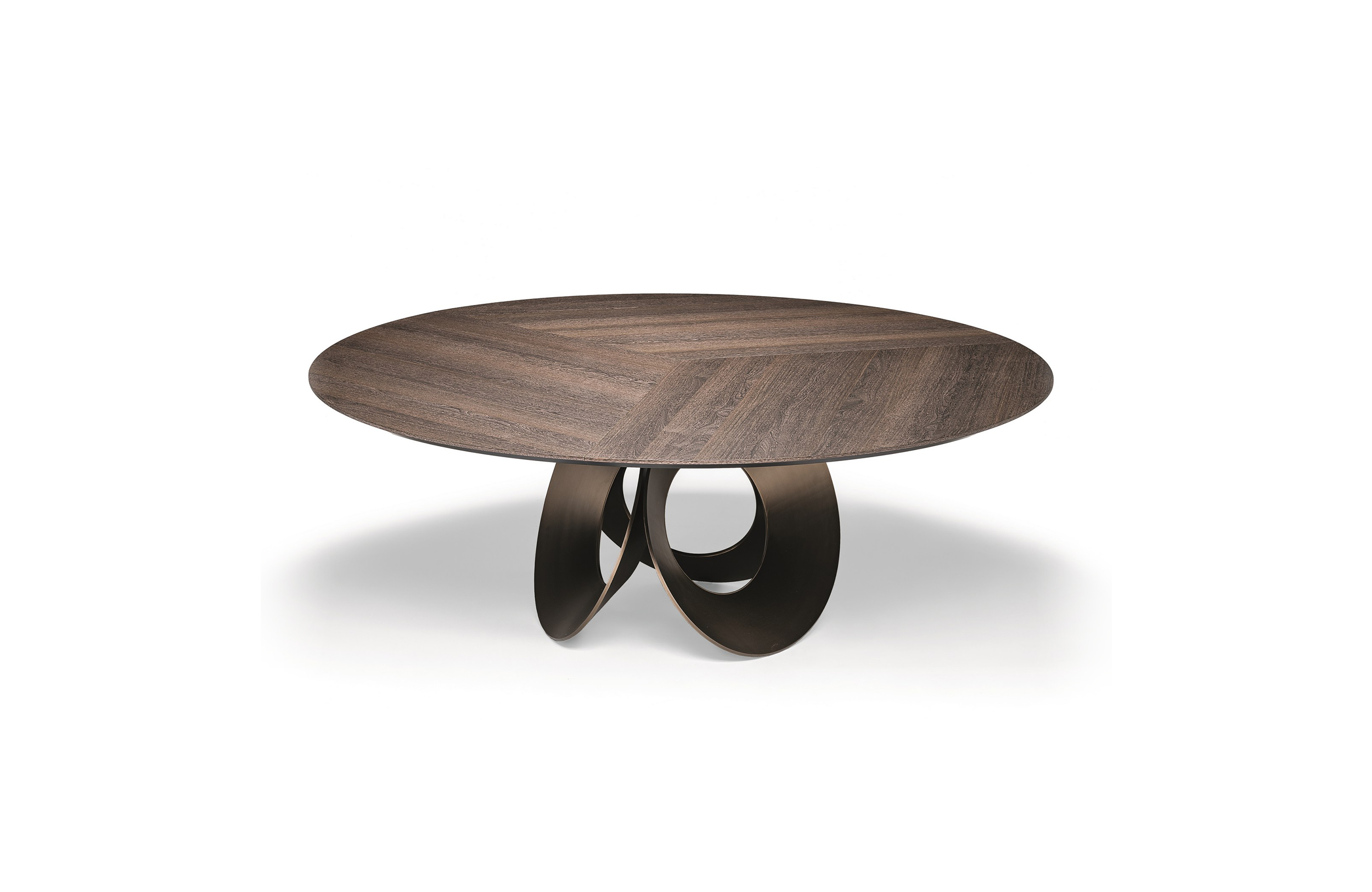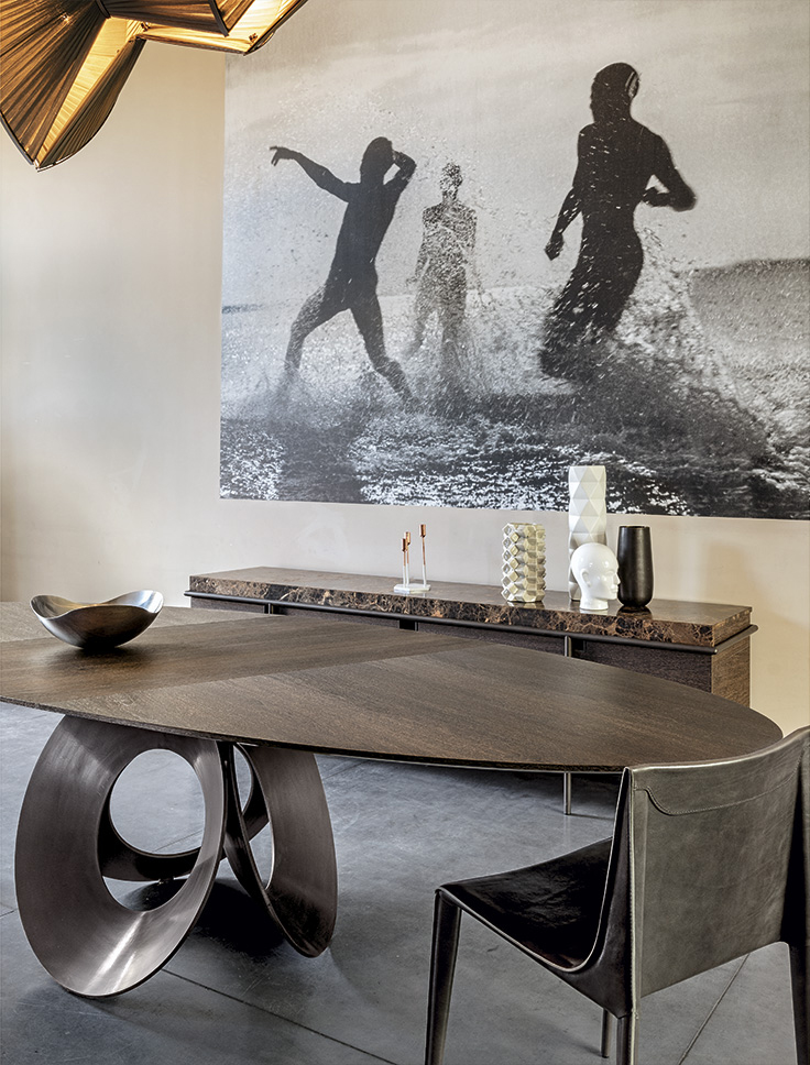 由吉诺·卡罗罗(Gino Carollo)设计的Oracle餐桌是圆形的几何形状,是完美的象征。家具的形状表现出整体性和中心性。圆形或椭圆形的桌面是由MDF镶嵌在莫卡橡木或柚檀木上。直径为200CM的桌面也可以使用啡网纹大理石桌面。它独特的底座就像生命之花的构造:三个重叠的圆圈,似乎围绕着一个点旋转。该金属的底座可用云母棕色、黄铜、钛或新草灰色抛光。