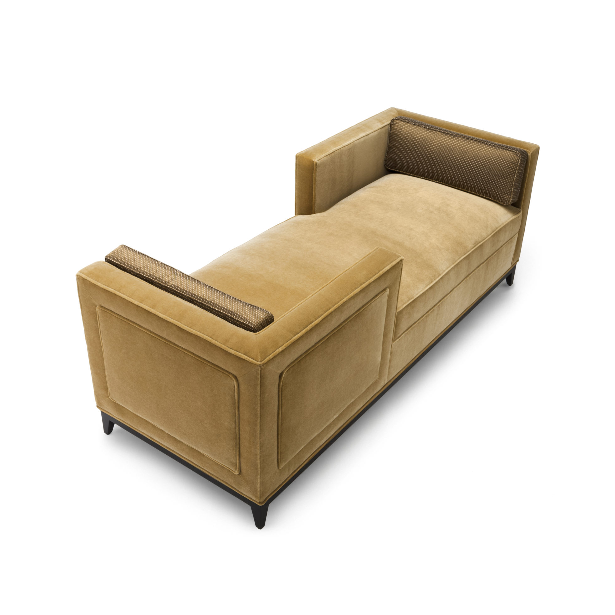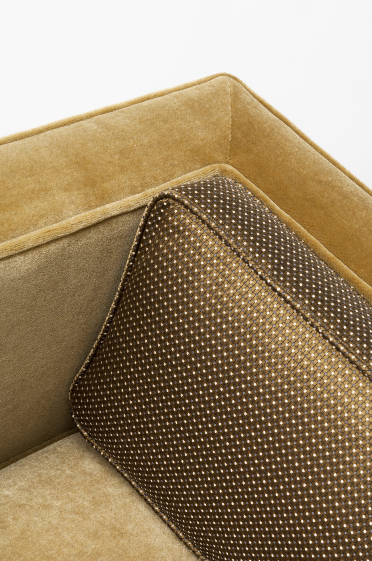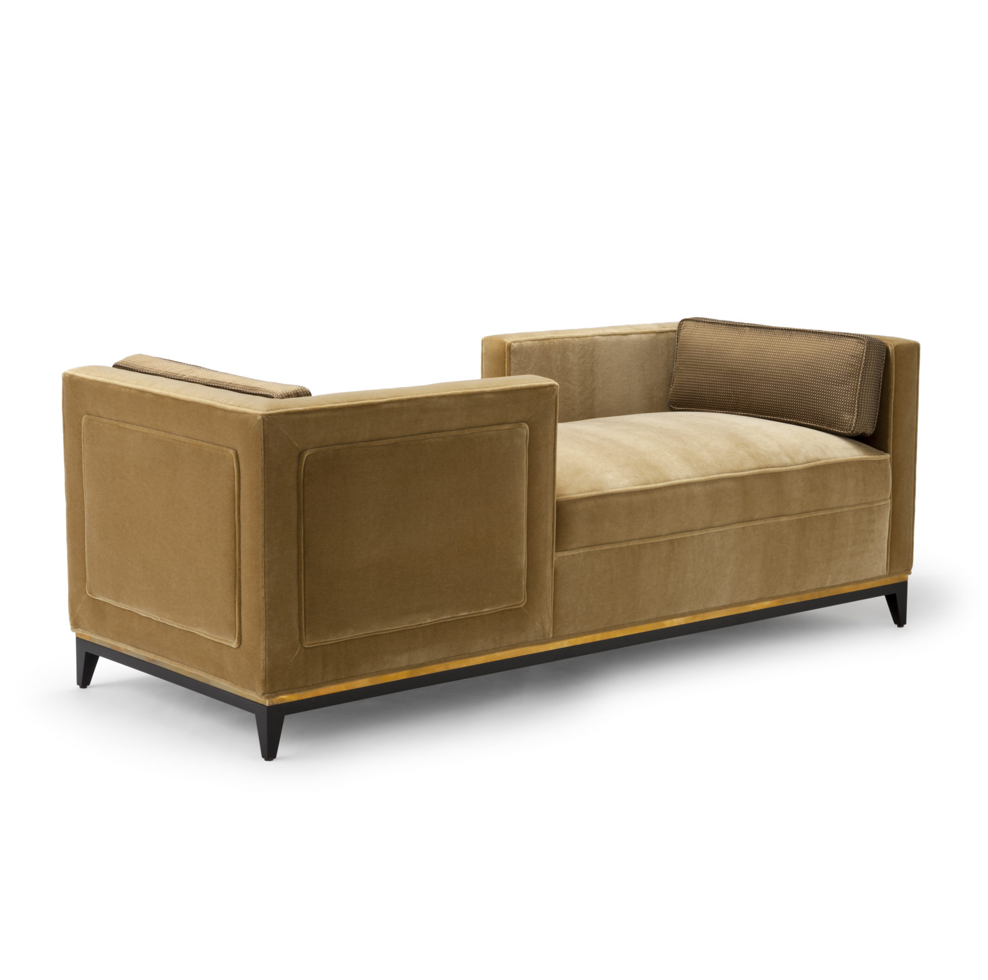 这里展示的是我们的“Camel”马海毛软垫,配有我们的Pixel面料垫子,未上漆的抛光黄铜金属条纹和美国黑胡桃巧克力黑檀木腿。
