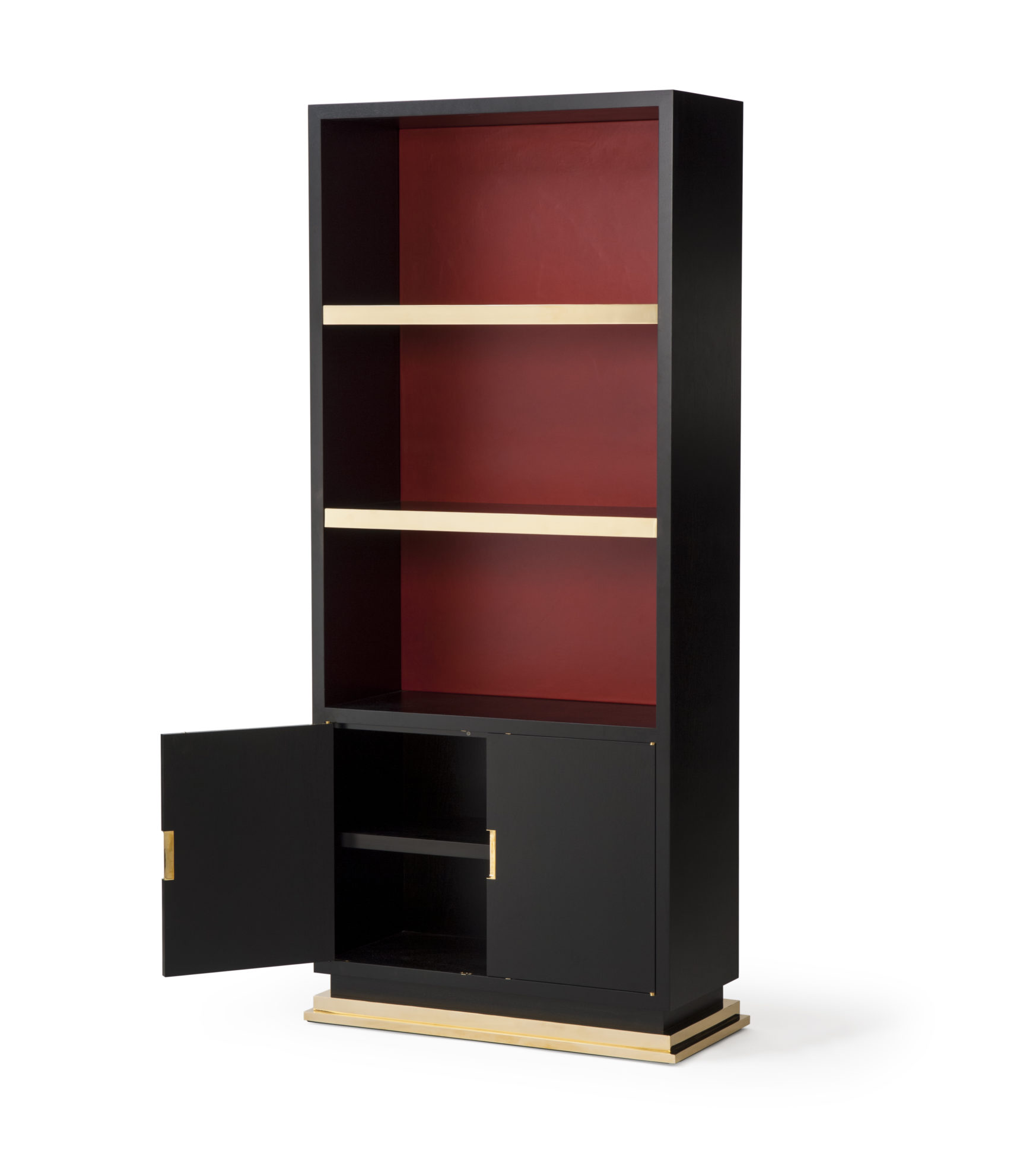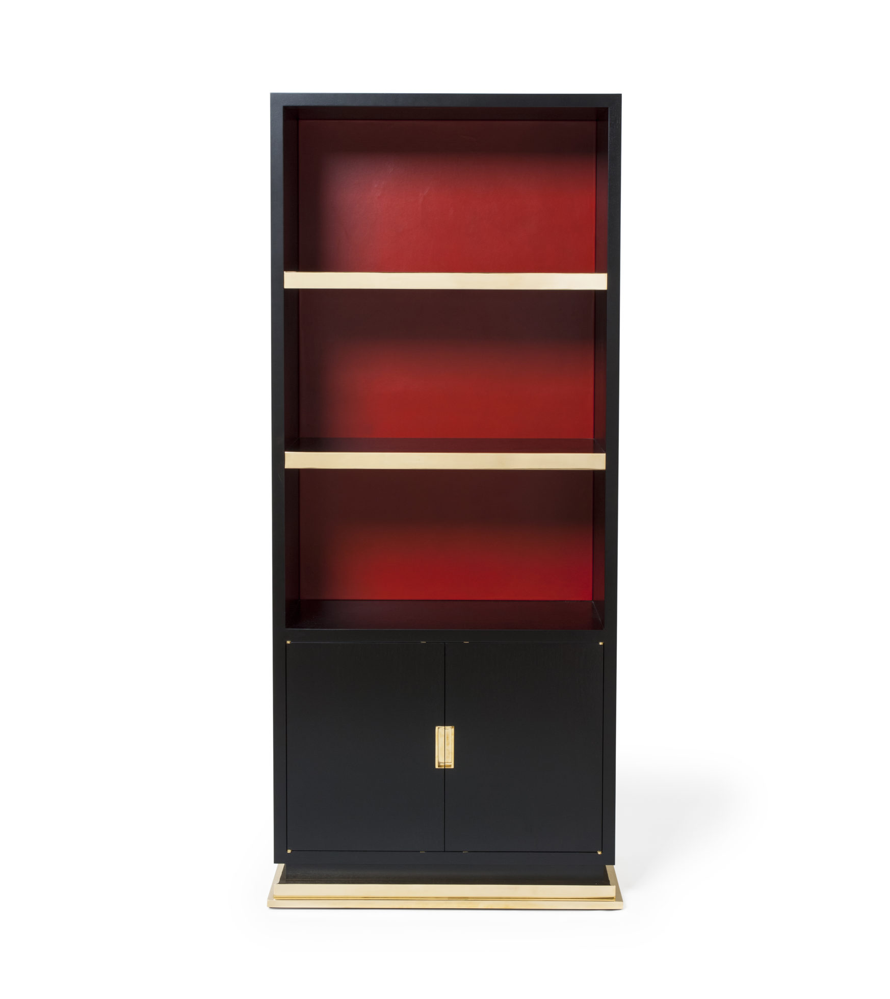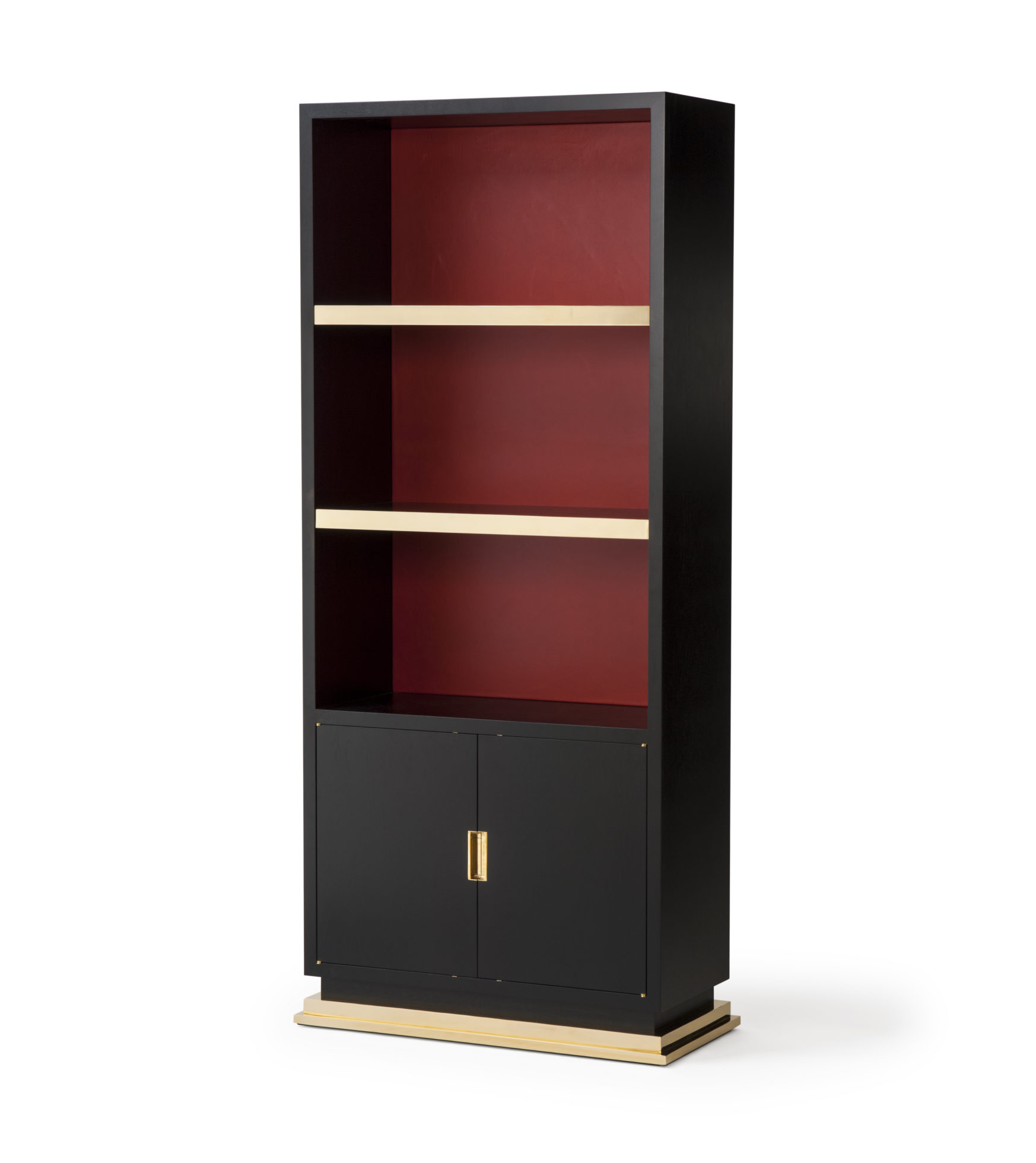 小巧但形状完美的书柜,配有真皮背板,定制手柄和抛光黄铜细节。 可订购尺寸。 这里展示的是美国黑胡桃黑檀木缎面,抛光黄铜细节和红色皮革背架。