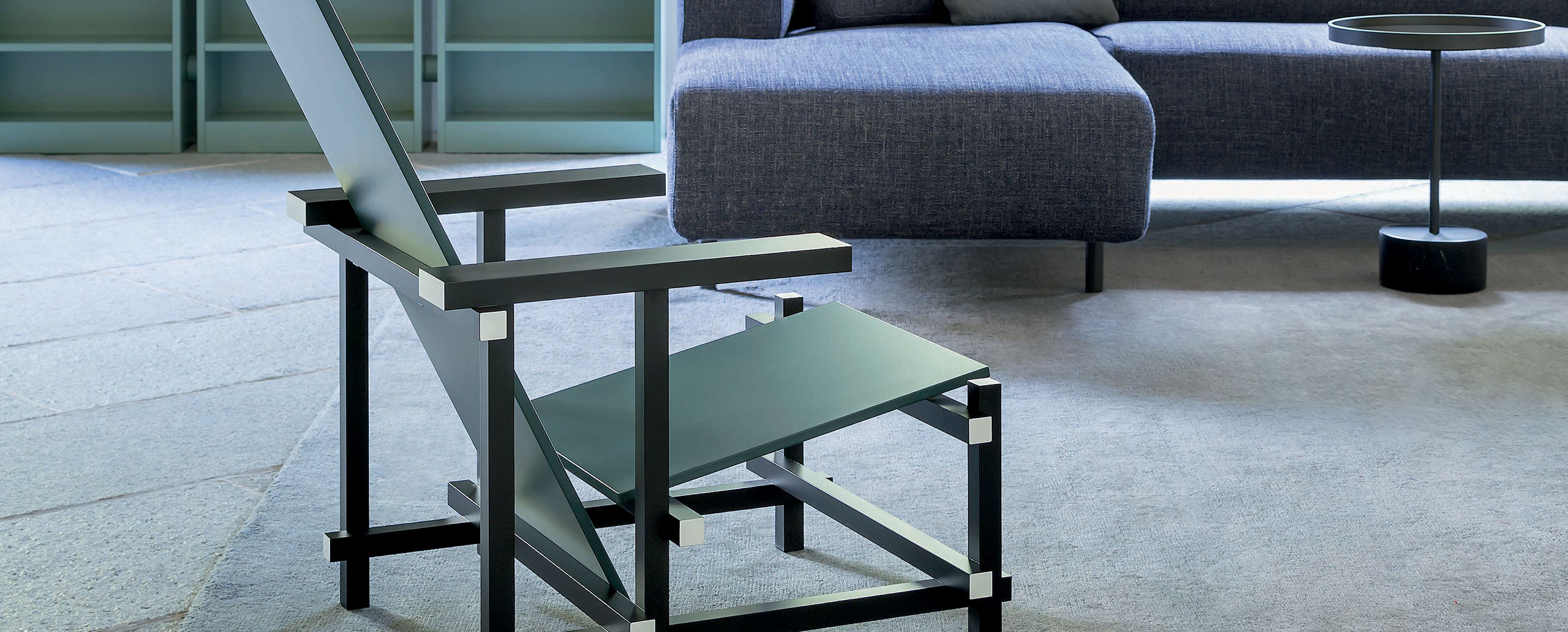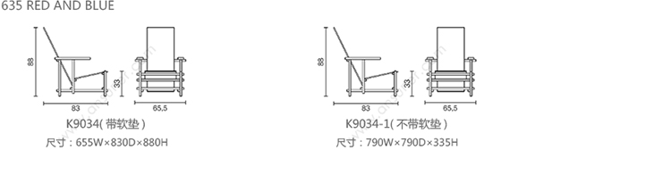 经典的红蓝椅是一款躺椅。框架采用黑榉木制造。座面(蓝色)和椅背(红色)采用涂漆胶合板制造。微妙地玩转了水平和垂直线,这款造型独特的椅子成为荷兰风格主义的宣言。该款椅子框架的所有部分重叠地组装在一起,而不是使用接缝组装。该设计的主要颜色是向蒙德里安绘画致敬,框架为红色、蓝色、黄色和黑色,划分除了具体功能的不同部件。