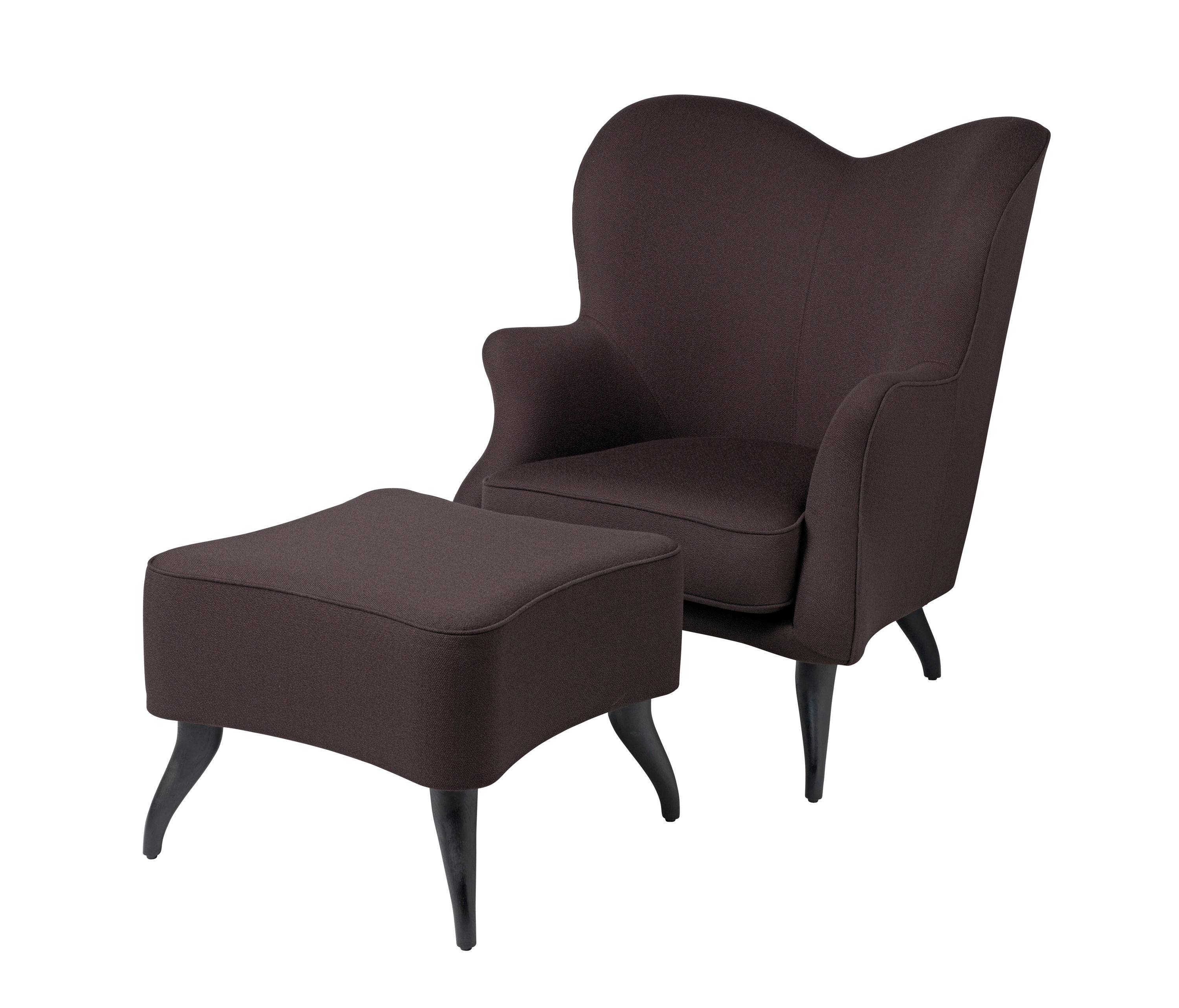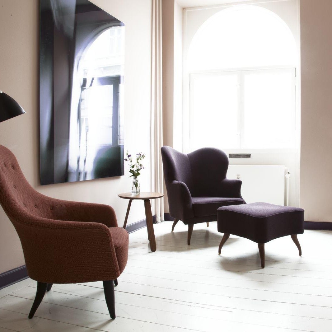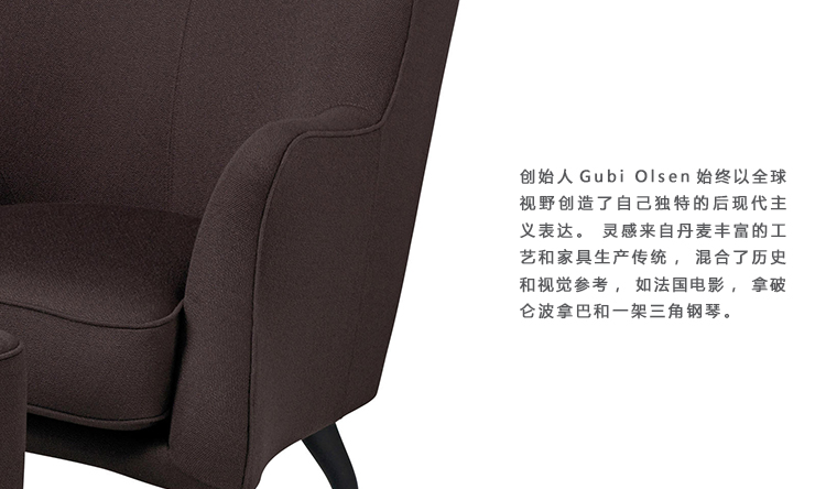 The Bonaparte Collection comprises a sofa, lounge chair and a pouffe.Gubi的创始人Gubi Olsen始终以全球视野创造了自己独特的后现代主义表达。 灵感来自丹麦丰富的工艺和家具生产传统,混合了历史和视觉参考,如法国电影,拿破仑波拿巴和一架三角钢琴。