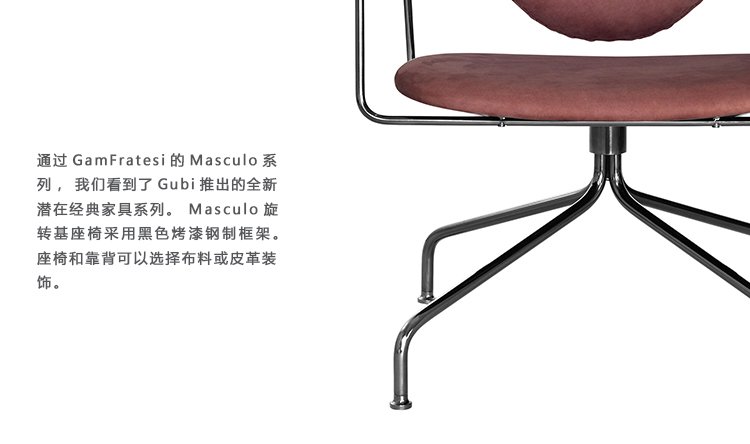 通过GamFratesi的Masculo系列,我们看到了Gubi推出的全新潜在经典家具系列。 Masculo转椅采用粉末涂层黑色或铬钢杆结构。 座椅和靠背可以选择布料或皮革装饰。 包括塑料滑动,可根据要求提供毛毡滑动。 还提供不同的基本选择以及休息室版本。