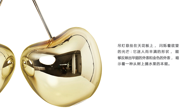 吊灯悬挂在天花板上,闪烁着欲望的光芒:它迷人而丰满的形状,能够反映出华丽的外表和金色的外表,暗示着一种从树上摘水果的本能。