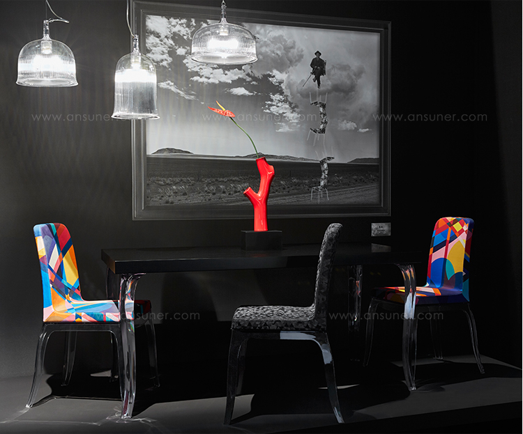结合设计师Marcel Wanders和Stefano Giovannoni的才能,新系列产生于他们看似不可避免的合作。两者都喜欢用自己在商业和艺术上都珍视的标志性作品来建立自己。 B.B.系列包括一张餐桌和配套的餐椅,让人联想到Wanders的New Antiques系列。提花织物装饰在餐椅上,可选择黑色,白色和彩色图案。座椅放置在透明或黑色透明塑料底座上,注塑成型用于弯曲外观。这种款式的腿也体现在餐桌上,中密度纤维板的顶部,并有各种其他尺寸。这套装置可灵活调整,以适应许多室内设计。经典原型的重量与薄而透明的塑料的轻盈形成鲜明对比。设计最精美,表达了设计师的愿望,即培养他们创造的物体和环境以及将生活在其中的人之间的关系。