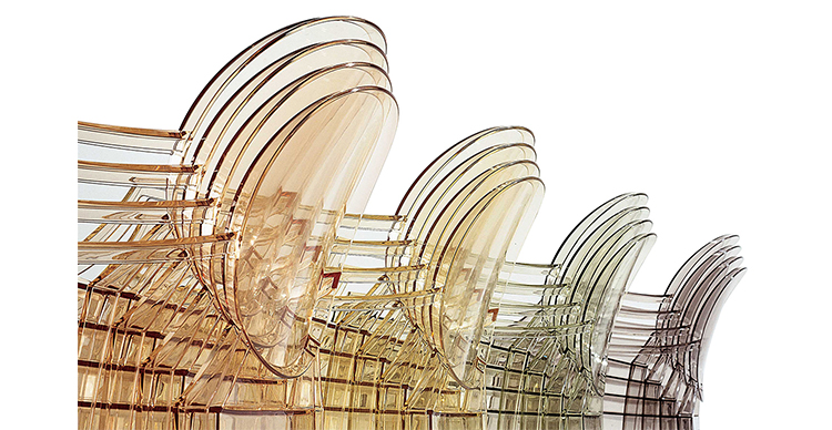 ouis Ghost 是以透明彩色的聚碳酸酯為材質,並有路易十五時期的巴洛克式風格,堪稱世上最大膽的使用聚碳酸脂注入模型中之作。儘管外觀上看起來纖細且透明如水晶一般,但實際上 Louis Ghost 卻是穩固且耐用的,經得起搬動、刮傷及天候的轉變,在收藏上,Louis Ghost 可以堆疊到六個之多。無論放在任何風格的住家或公共空間,Louis Ghost 皆能吸引眾人的目光並帶點優雅與反諷。