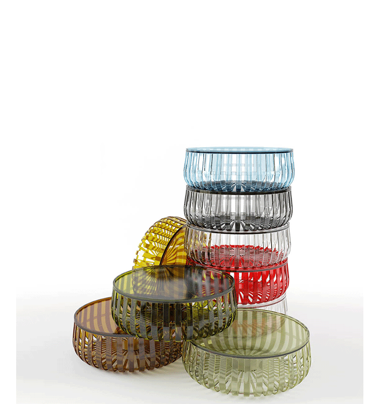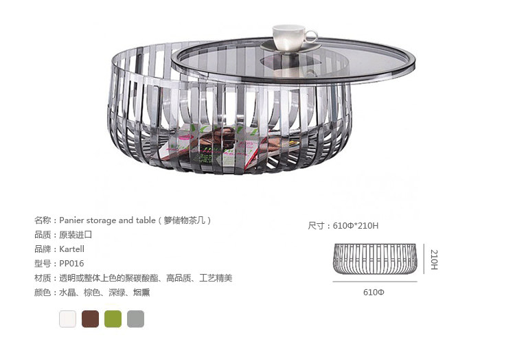 Panier是Ronan与Erwan Bouroullec这对兄弟档设计师第一次为Katrell设计的作品,采用PC-聚碳酸酯材质,经过严密的技术与功能研究创作出来这个造型独特的储物茶几。Panier是款有附透明盖子的储物茶几,盖子也是由相的材质的塑料制成,若将Panier的盖子盖上,无论是单独或是堆叠起来使用,都是相当好且十分抢眼 的的边几。不拘一格的设计,可以是桌子、储藏容器、杂志架。。。。只要发挥一点点小想像力Panier便能轻松为生活妆点无限色彩。