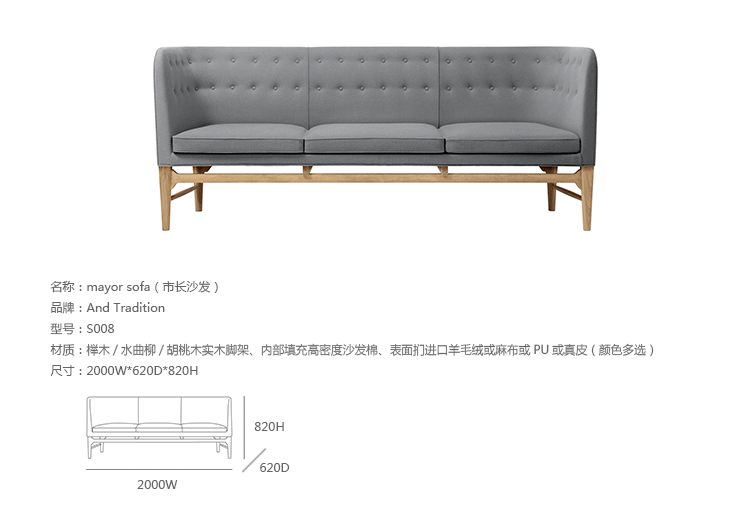 Mayor Sofa(市长沙发)是丹麦设计大师 Arne Jacobsen在1939年设计的作品,是经典的斯堪的纳维亚设计,市长沙发创建了真正的堡垒,让坐在背后的人感觉受保护,并很好的隐藏视野,设计充分考虑人体工学,满足绝佳的舒适度。复古而又时尚的设计,至今任大受推崇。制作采用榉木/水曲柳/胡桃木实木脚架、内部填充高密度沙发棉、表面扪进口羊毛绒或麻布或PU或真皮(颜色多选)。