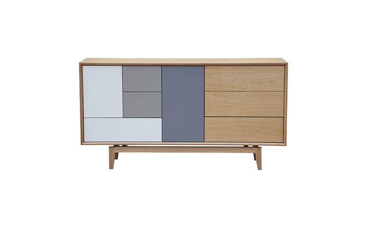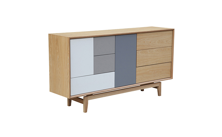 “platform sideboard(平台餐具柜)是Kardiel公司制作的经典实木家具,有着迷人的中世纪设计风格和当代形式巧妙融合,餐具柜主体平台由三个胡桃木单板抽屉和不同色调三聚氰胺组合面临抽屉和门组成。在20世纪50年代末,60年代初, Finn Juhl和 Arne Vodder 最先尝试胶木和天然木的组合运用,并流行至今。这是大胆的创新,他们结合传统的新鲜的新兴技术与现代主义的概念。制作采用精选MDF板基材胡桃木或水曲柳木皮贴面、实木脚架、环保油漆喷涂,做工精湛,品质一流。”
