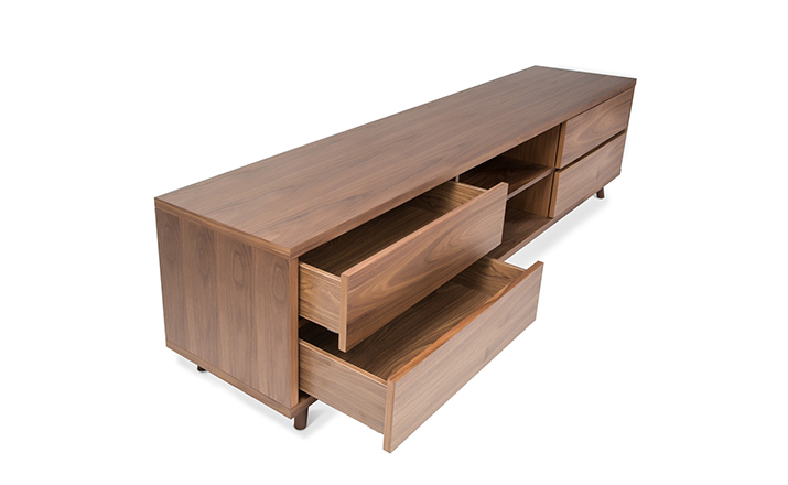 glenoaks TV stand(glenoaks电视柜),中世纪风格,复古别致,设计精美,长方形的设计非常适合摆放电视,此外平台下面还有4个抽屉和2个开发的空间,给您更多存储空间。制作采用精选MDF板基材胡桃木或水曲柳木皮贴面、实木脚架、环保油漆喷涂、做工精湛。
