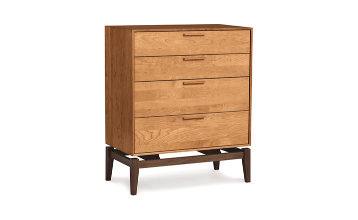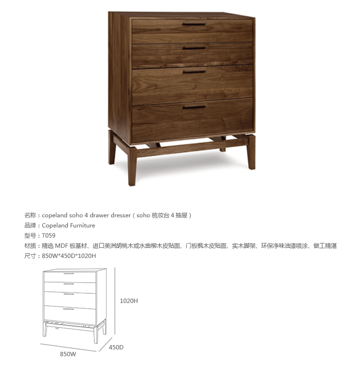 copeland soho 4 drawer dresser(科普兰soho 4抽梳妆台)是Copeland Furniture公司copeland实木系列之一。我们塑造环境,然后环境塑造我们,copeland旨在传递的舒适度和清晰度的感情。设计借用了一些最优秀的传统和当代的设计要素,非常具有特色。这个中世纪现代风格的设计,提供了4层平滑抽屉存储空间,可以使您更好的归纳自己的物品,提供大量存储空间。制作采用精选MDF板基材、进口美洲胡桃木,贴面、实木脚架、彩色装饰边、环保净味油漆喷涂、做工精湛。