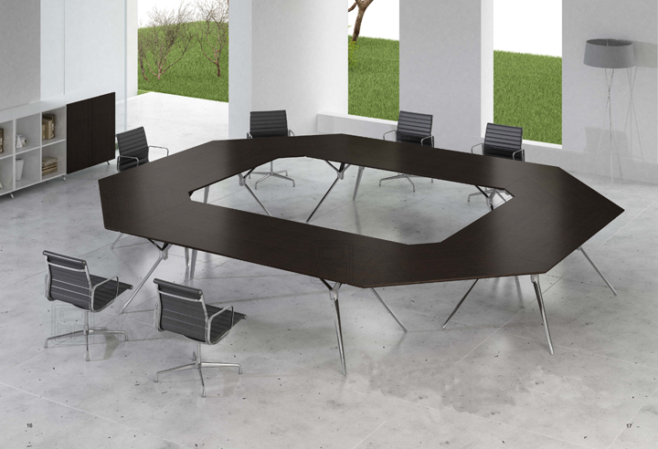 ※ 上图为 O型组合会议台,是一款简洁、时尚而不失大气的现代产品,明快的木纹色彩,制造不一样的办公气氛.高亮光铝合金脚架,外形棱角分明,具有文雅风格。