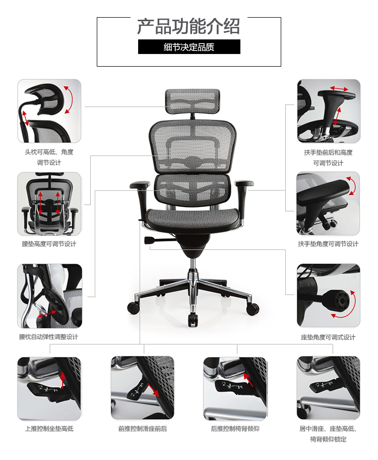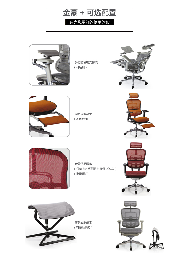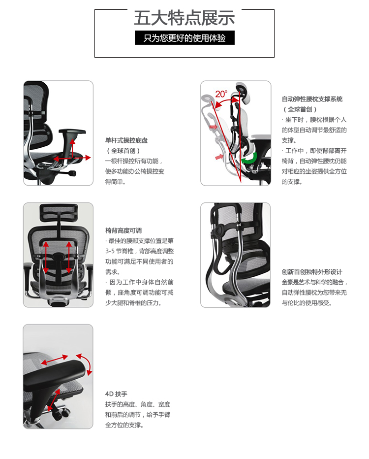 全球首创的单杆式操控底盘,一根杆操控所有功能,使办公椅的操控更加人性化;自动弹性腰枕支撑系统,无论是在坐下时、工作中、或者后仰时,都能让使用者的腰和背获得最舒适的支撑;金豪+系列采用完全性多功能调整设计,从头枕、椅背、扶手与座垫可进行全方位的调整