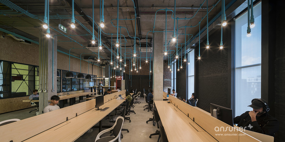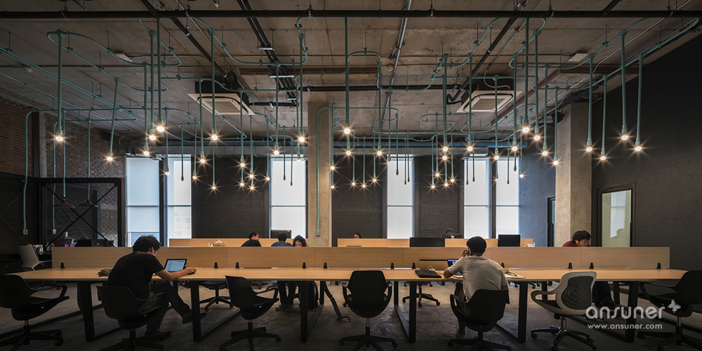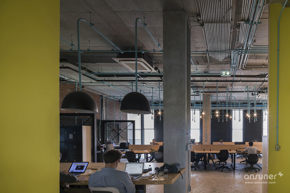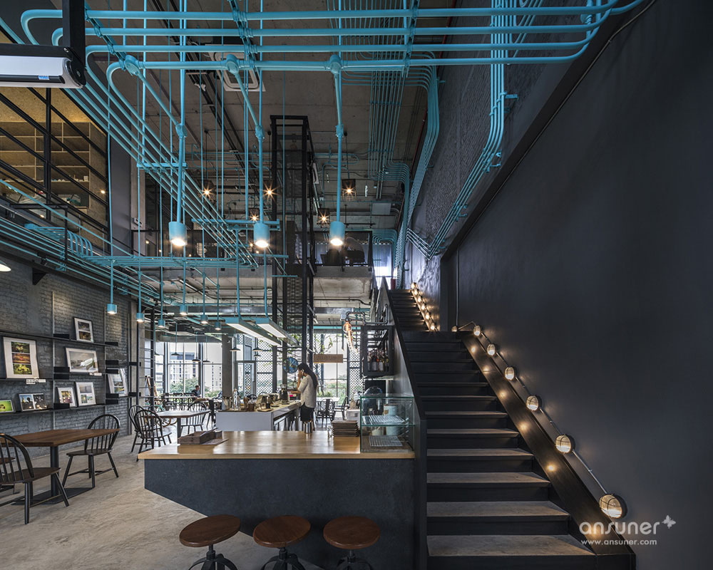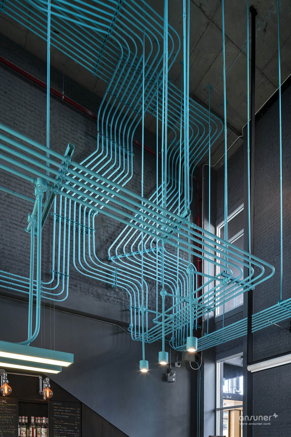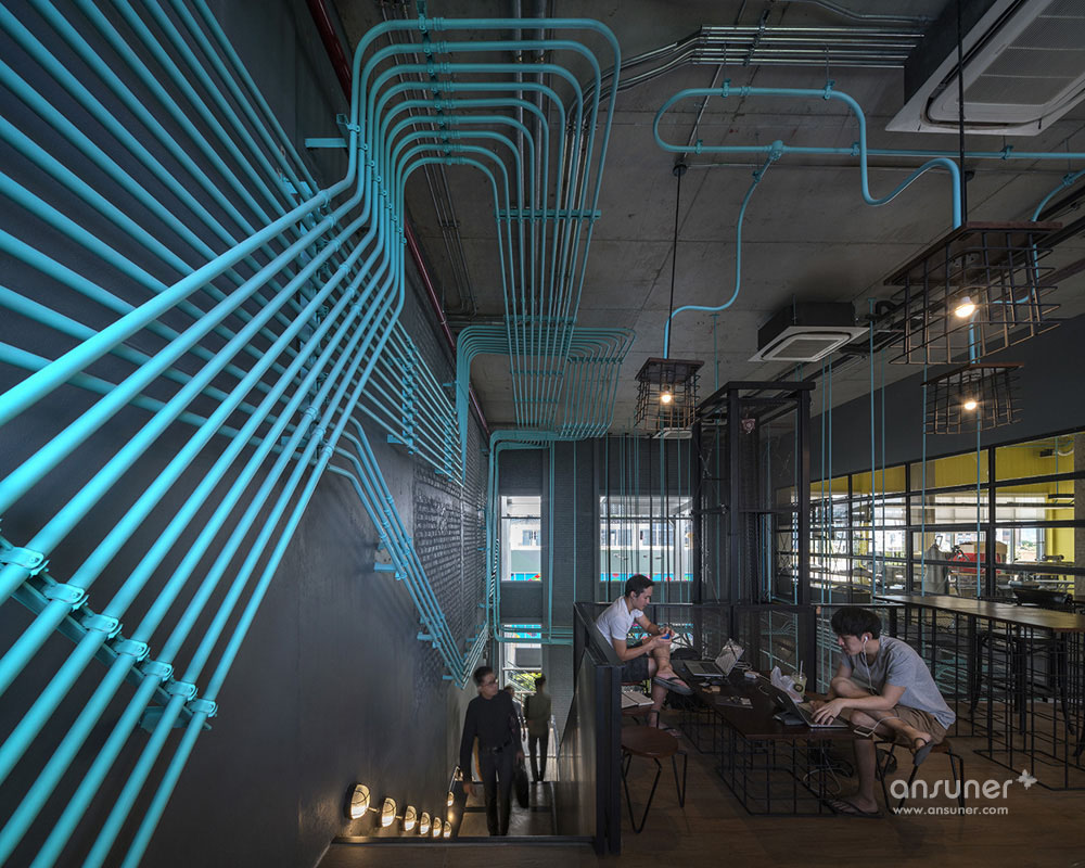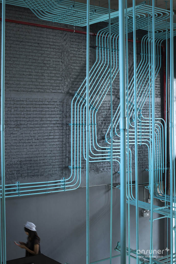 Hubba-to的创意灵感源自于Hubba的网络状标志图形,设计强化并延续这种网络线条,将其演化为有趣的空间元素,蔓延穿梭于一至二楼从而形成统一的视觉空间。这样的构想之所以能实现,是因为现实施工中确实存在许多的机电设备管线。Supermachine设计团队只要善加利用这些管线、并刻意强化增加管线系统、然后有目的的设计组织管线安装路径。纵横交错的管线一律喷成漂亮的绿松石色彩,流畅的蓝绿色管道在墙面、天花、空间中婉转穿梭,营造出令人震撼的视觉效果,为沉重的工业风带来灵动和创新。