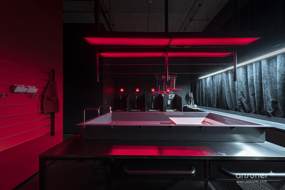 本案的设计对设计师无疑是一个创意启发。作为设计师,一直与工程中遇到的无数管线相抗争,而本案,设计团队决定利用现有的无穷管线,并刻意加以强化与夸张,从而成功塑造了独具视觉张力的魅力空间。