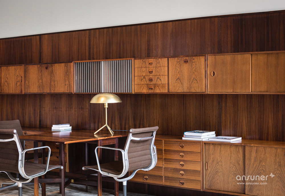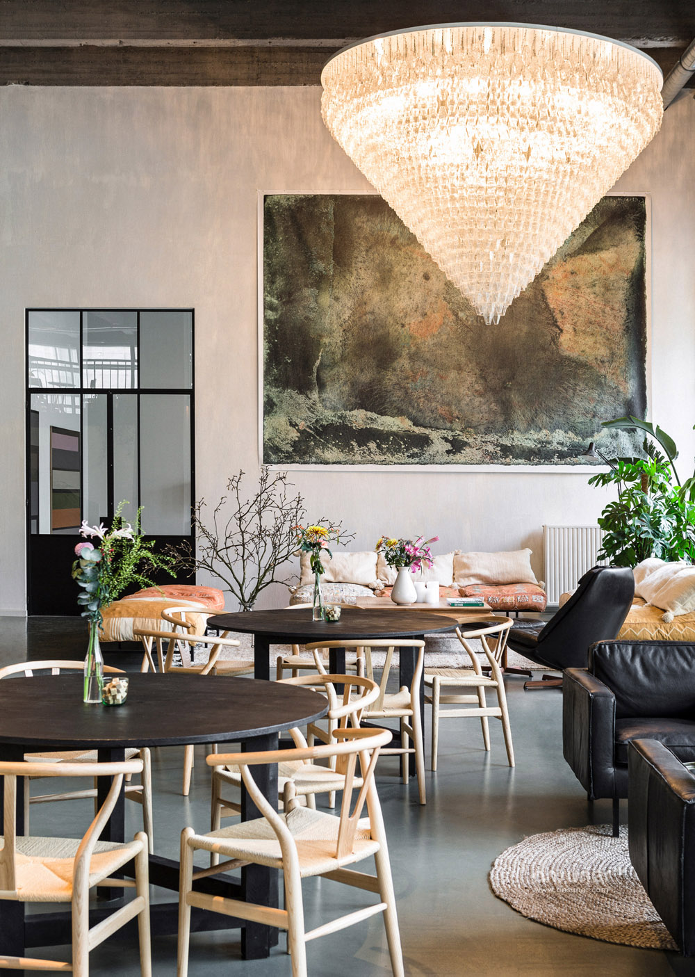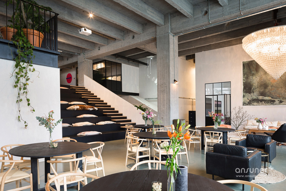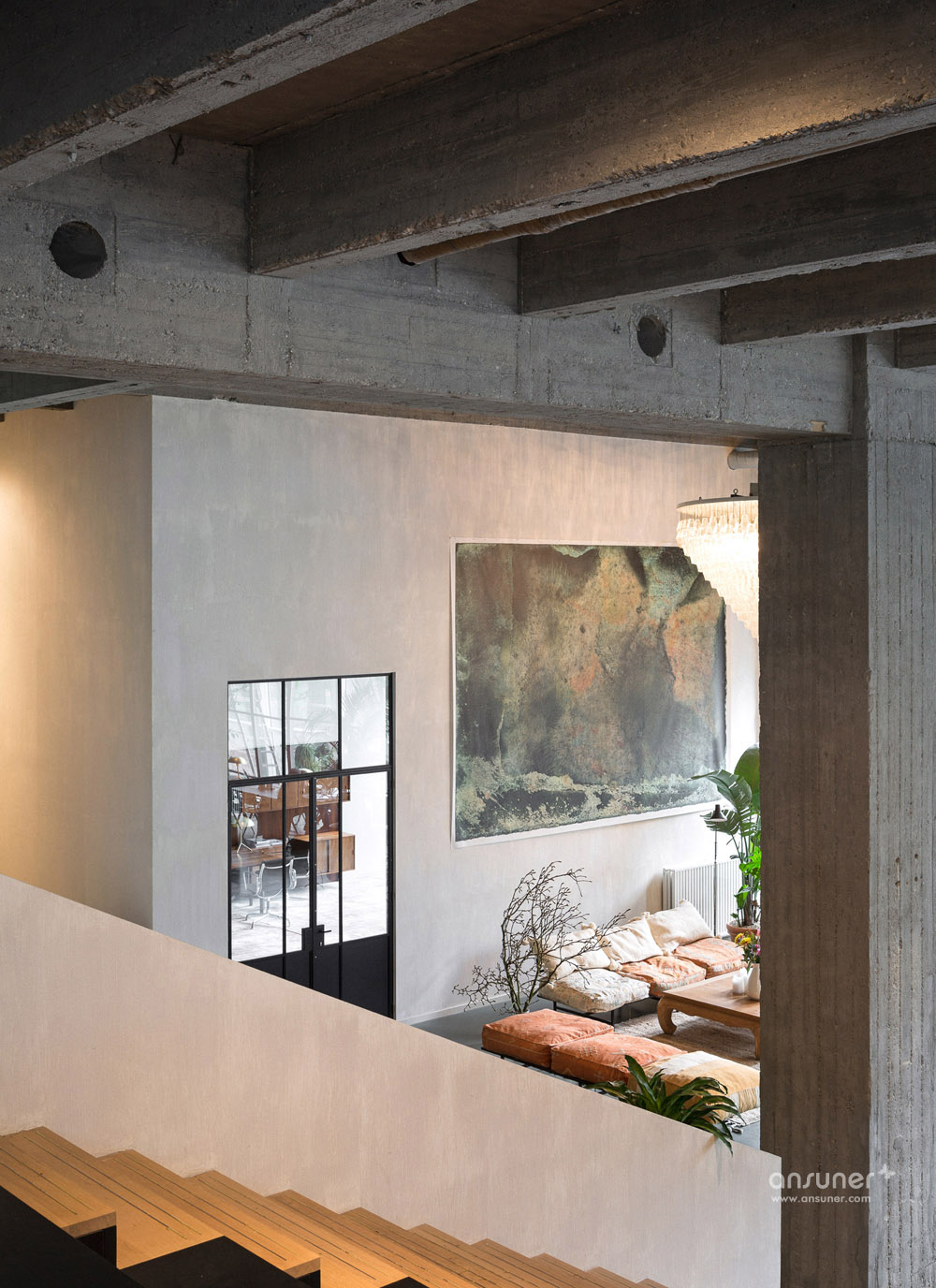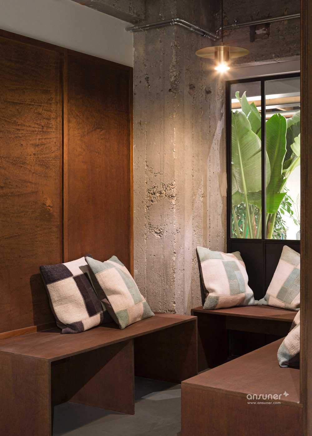 设计团队为这个空间定制设计了一些元素,比如由回收砖块和玻璃纤维制作的吧台。其它的如丹麦摩登傢俬、当代艺术作品和工艺品的完美混搭。漂亮的沙发来自比利时的家具品牌Journuit。