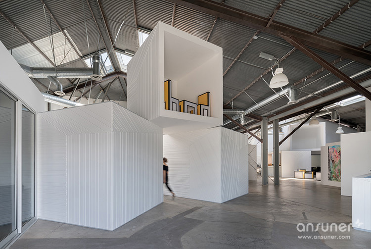 FreelandBuck最近完成了在洛杉矶的Hungry Man Productions总部设计。当被要求重新考虑办公室的组织时,设计师将员工的身份的轻松与一系列颠倒的隔间相匹配 ,这些隔间有趣地挑战了典型的办公空间的规律性。整个大型开放式办公区松散组织,非正式的安排创造了多样化的稳定和灵活的工作配置。此外,设计上充分利用 了仓库外壳的天花板高度,将箱体堆积起来,使视觉上突显和投影区域。在用cnc研磨的MDF的表面处理和涂上细节的表面处理这些翻滚的立方体。从特定的角度来看 ,这些铰接的表面创造了空间错觉和活跃、动态的工作氛围。