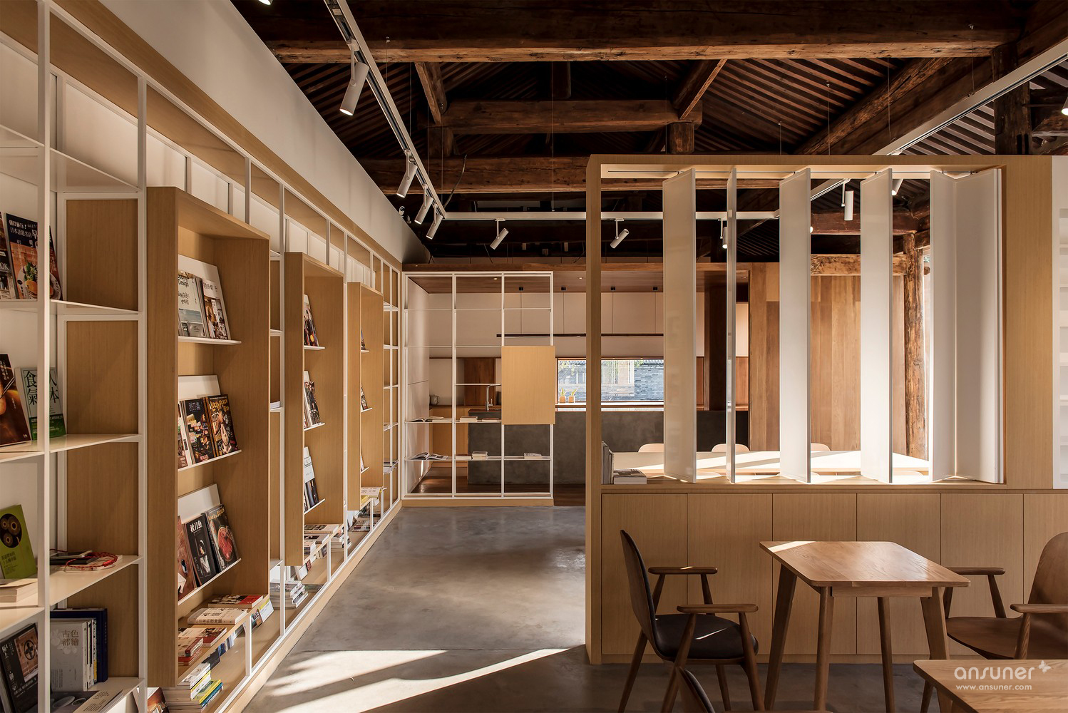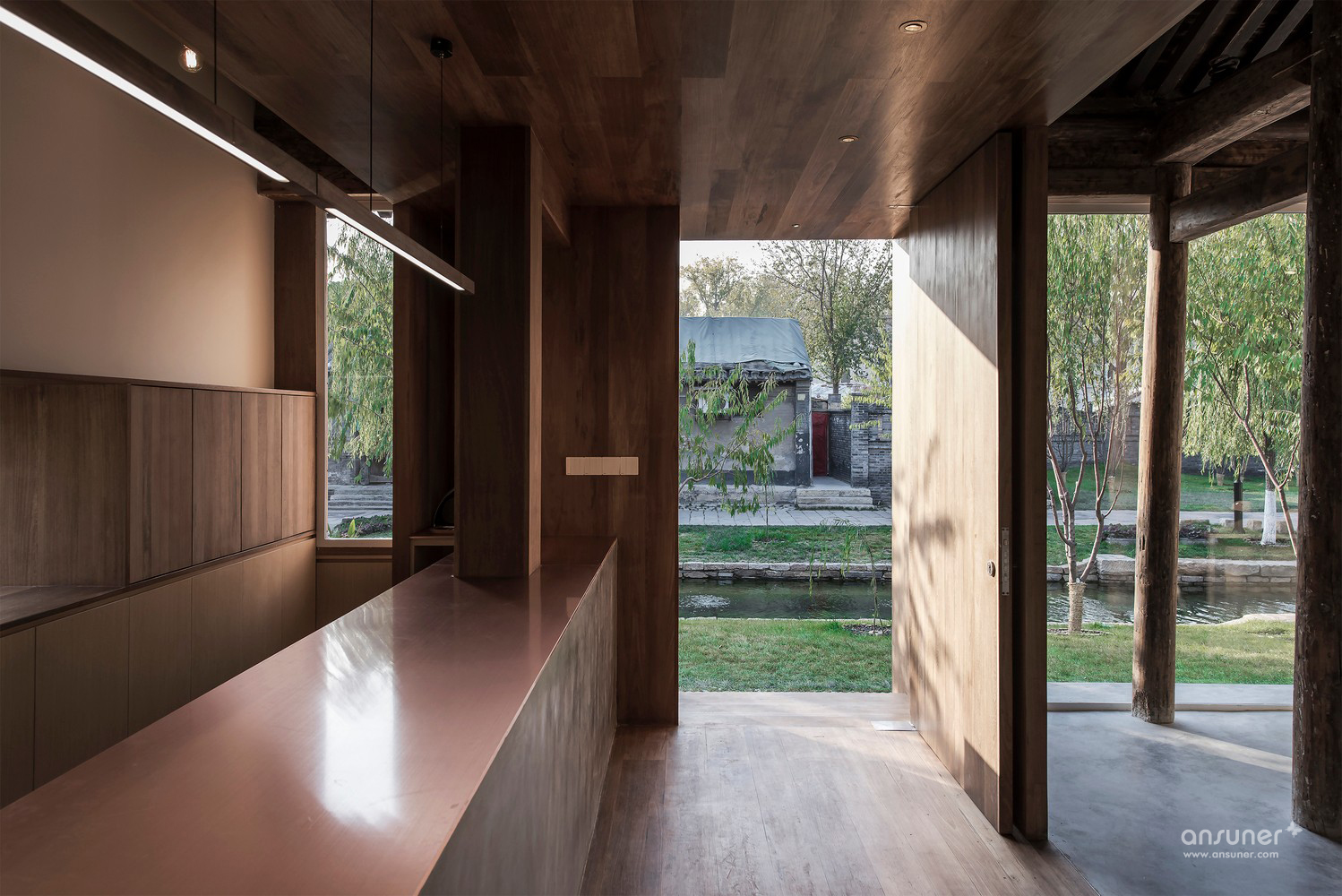 在灰色水磨石的连接下,沿河的立面用节奏较为舒缓的矩形体块排布开来。其中主入口连接了室内吧台区域,将它们组合在一个盒子当中嵌入房间,形成了简洁明确的功能划分。为书籍展示和阅读讨论设计的大工作桌放置于敞亮的玻璃窗旁,停留在此能感受饱满和谐的阳光和窗外恰到好处的小河垂柳。西侧格栅折叠窗设计巧妙地在回应传统装饰语言的同时也可用于夏日遮阳。