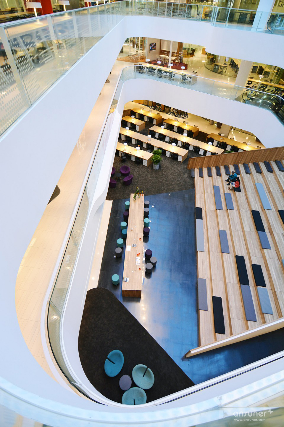 设计团队大胆采用橡木楼梯的设计,可谓化腐朽为神奇!“倾泻而下”的橡木楼梯间的设计将中庭一层打造成了一个开放的报告厅。报告厅不单为租客提供开会讨论的好地方,超大懒人橡木楼梯间更为自拍凹造型提供了绝佳之选!