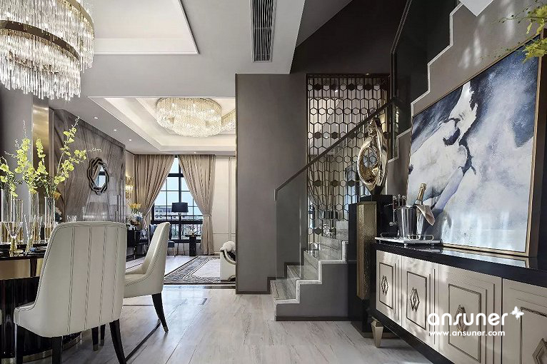 本案为复式空间结构,主打轻奢大都会风格,不仅空间尺度舒怡,所有主空间都有良好的观景视野,此外还特设有独特的观景露台,从内到外,从居所的尊贵享受延伸至真实的居家态度,均以低调的优雅、自然的华美、沁心的质感,诠释着大都会的精奢。