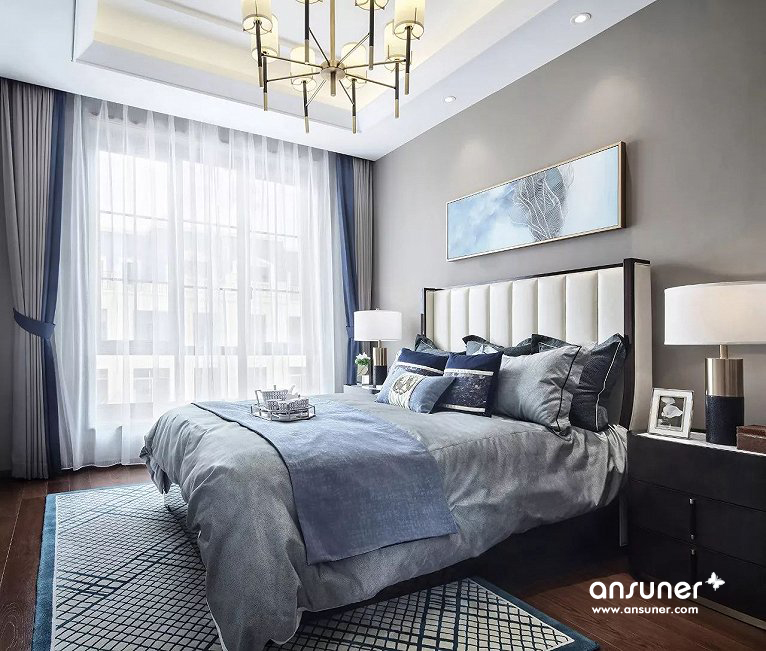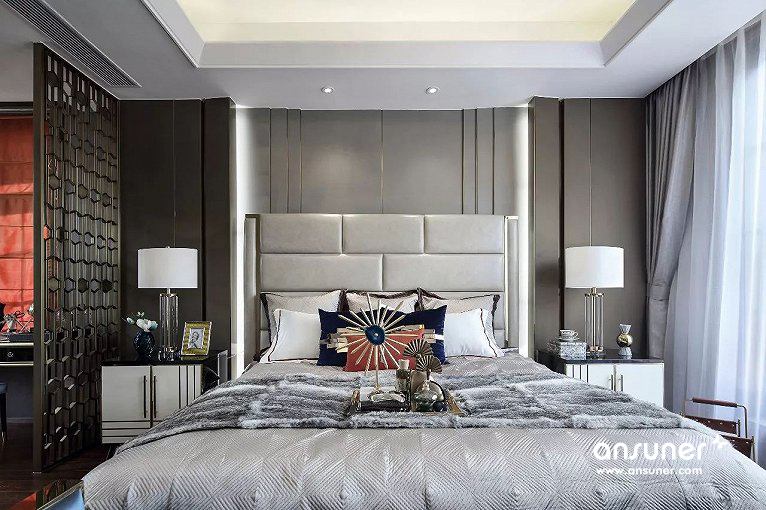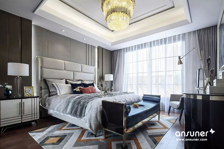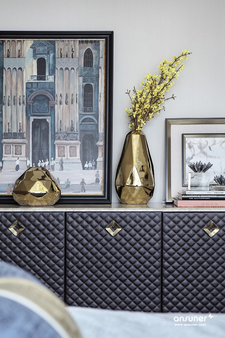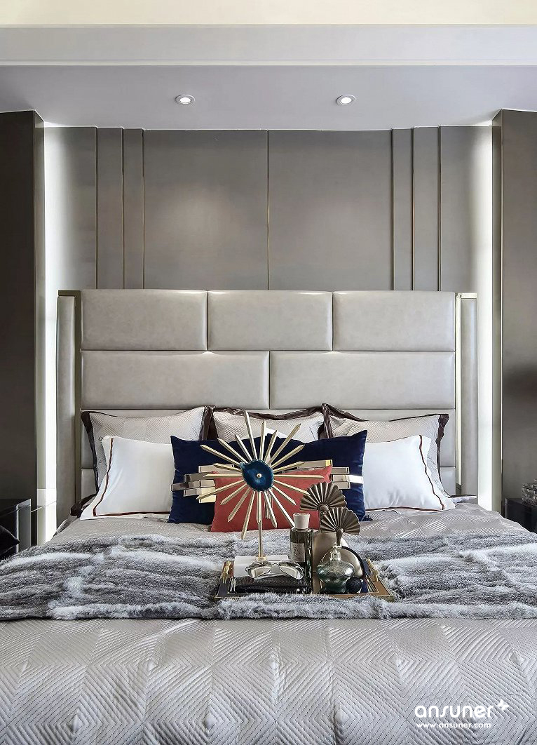 主卧组合了丝绒面料、马毛地毯、精致水晶、尊贵皮质等现代元素,呈现出品质生活的现代追求。设计灵感来自被誉为不夜城的“New York City ”,并巧妙介入都会元素,塑造出让人迷恋的简洁、奢华与雅致,让我们仿若置身纽约曼哈顿,沉浸在时尚优雅的都市氛围中,享受现代人心之向往的自由与洒脱。