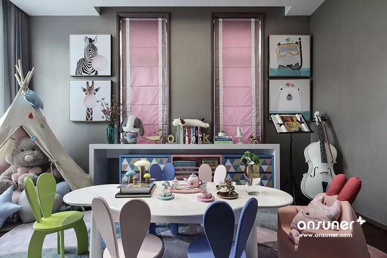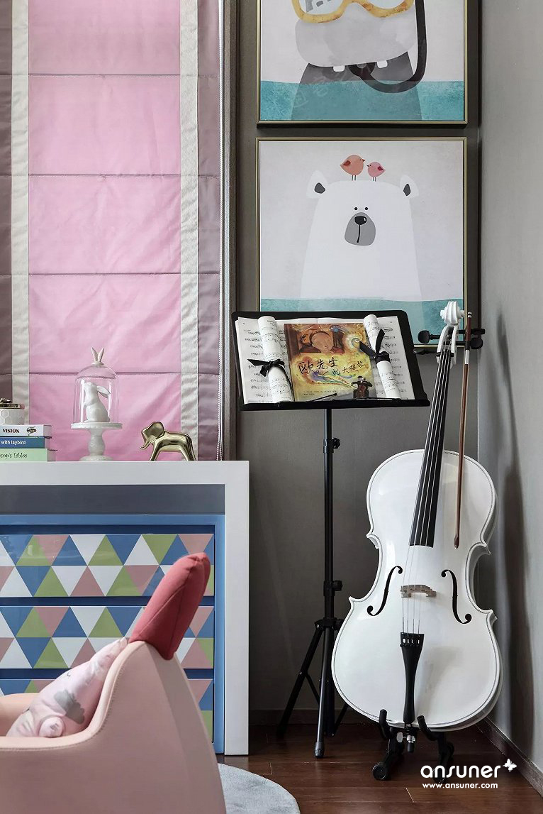 设计师专门打造了一个亲子娱乐空间,解决了许多家庭困扰不已的问题,有了这个功能独特的独立小空间,孩子乱丢玩具或者扰乱家庭陈设秩序的情况大大减少。设计不仅注重“童趣”,也添加了艺术氛围的营造,以音乐、小提琴为主题,辅以画画、阅读、游戏功能,整个空间充盈着甜蜜欢快的调调。